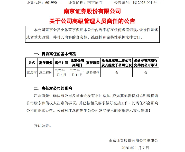 1月6日,南京证券股份有限公司(证券代码:601990 证券简称:南京证券)发布公司高级管理人员离任的公告。