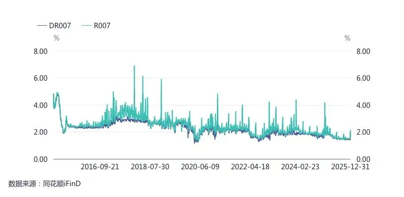 在金融市场中,DR利率水平(以银行为交易主体、质押券种为利率债)显著低于R(参与主体主要是非银、质押券可以是信用债)。以7天期资金利率为例,2016年-2025年间,DR007均值为2.36%,低于R007均值20BP。