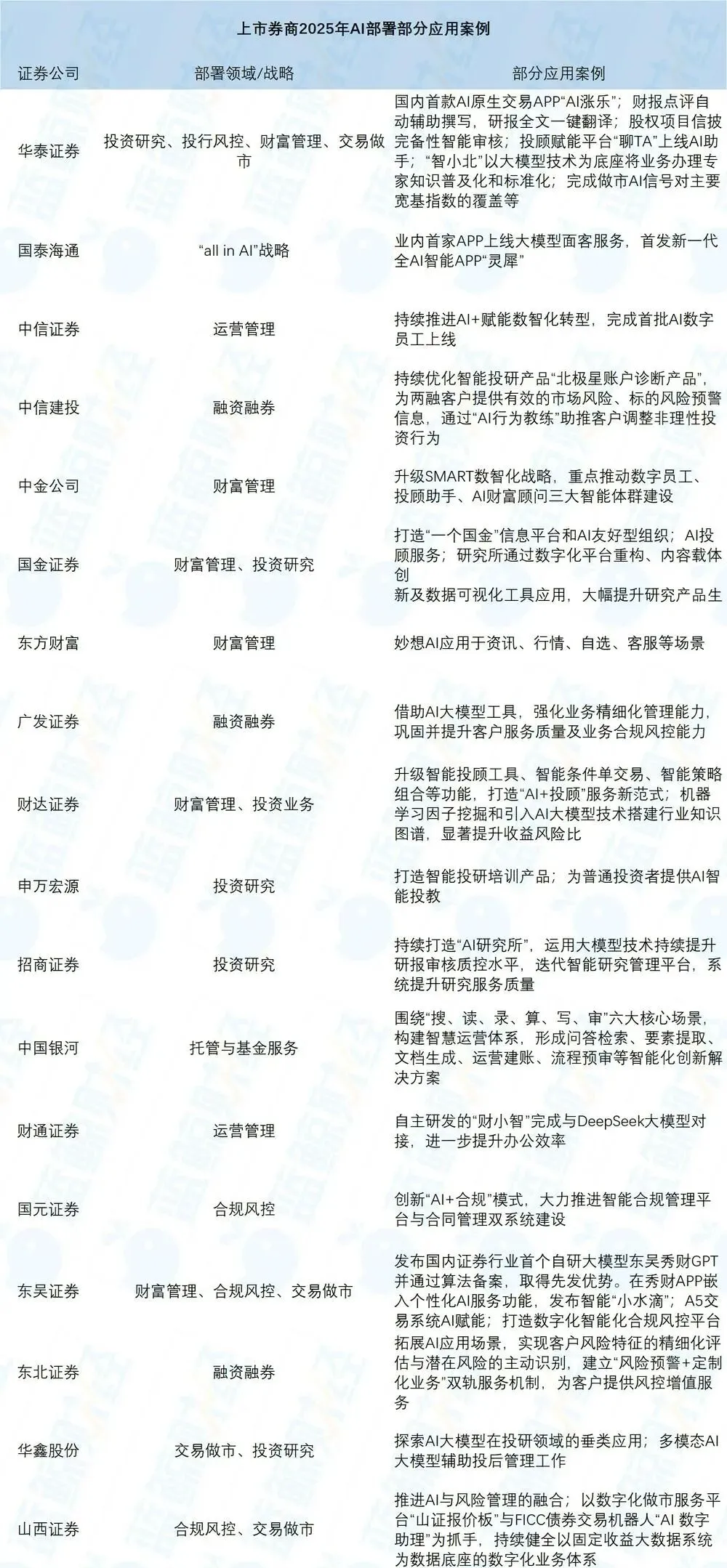 一些券商根据自身禀赋和业务发展需要,选择将AI应用在合规风控、运营管理、托管等不同领域。其中,广发证券、中信建投、国元证券、山西证券、东北证券将AI的应用场景拓展至合规风控领域,助力AI与风险管理的融合;财通证券、中信证券推进AI赋能运营管理,提升办公效率;中国银河则将AI嵌入到托管与基金服务当中。