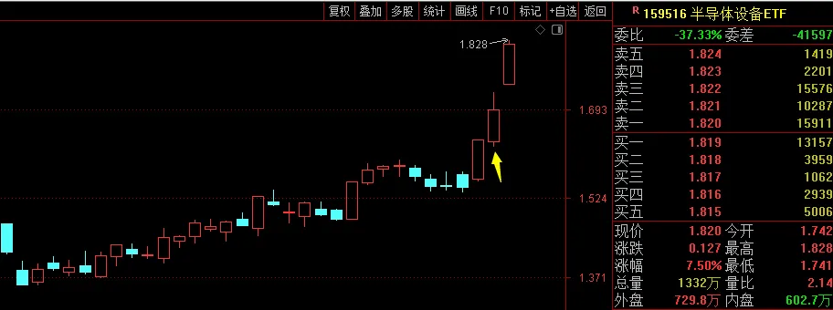 半导体设备,三天涨17%,从前天收盘到今天最高也有10%空间。