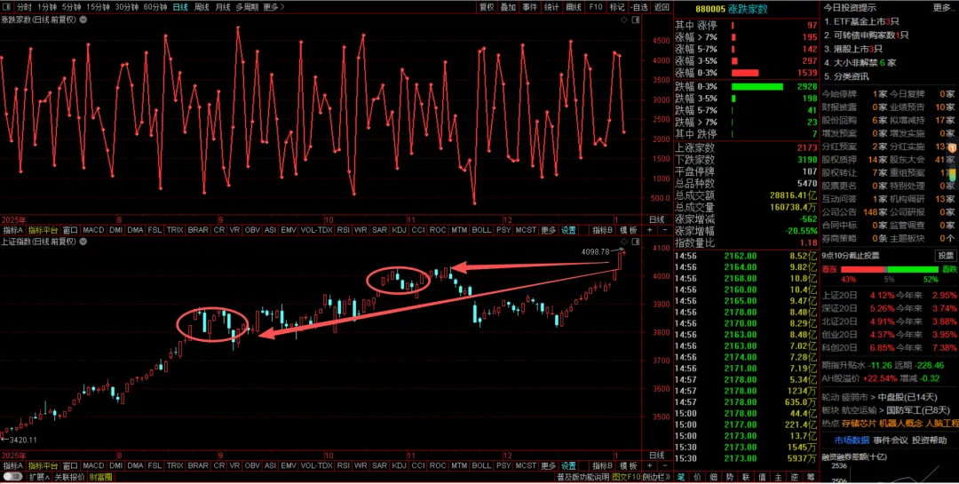 板块活跃度上看,轮动风格为主,活跃资金参与度上,虽有两大主角(商业航天、AI算力),但也不是一直的绝对压制其它题材,开门红市场放量下,轮动板块强度更猛