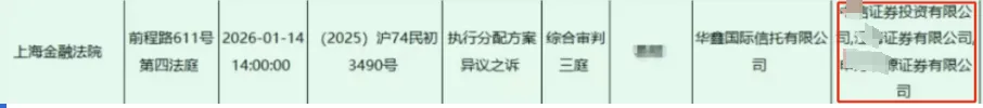据上海法院最新开庭公告,这起诉讼的案由是执行分配方案异议之诉,1月14日就要在上海开庭审理,简单的来说,就是之前可能有个案子涉及资产执行(比如还债、清收),到了分钱分资产的时候,华鑫信托对分配方案不认可,和这三家券商没谈拢,干脆就直接打起了官司