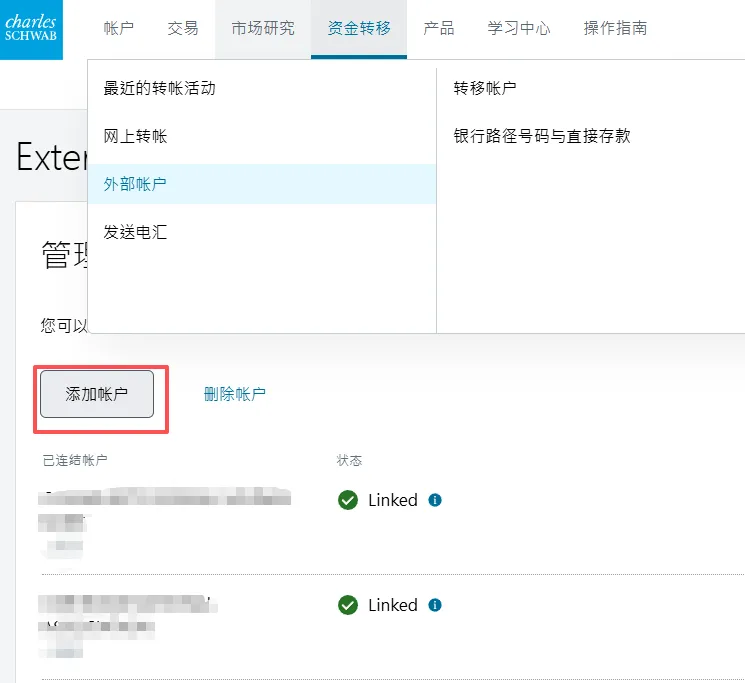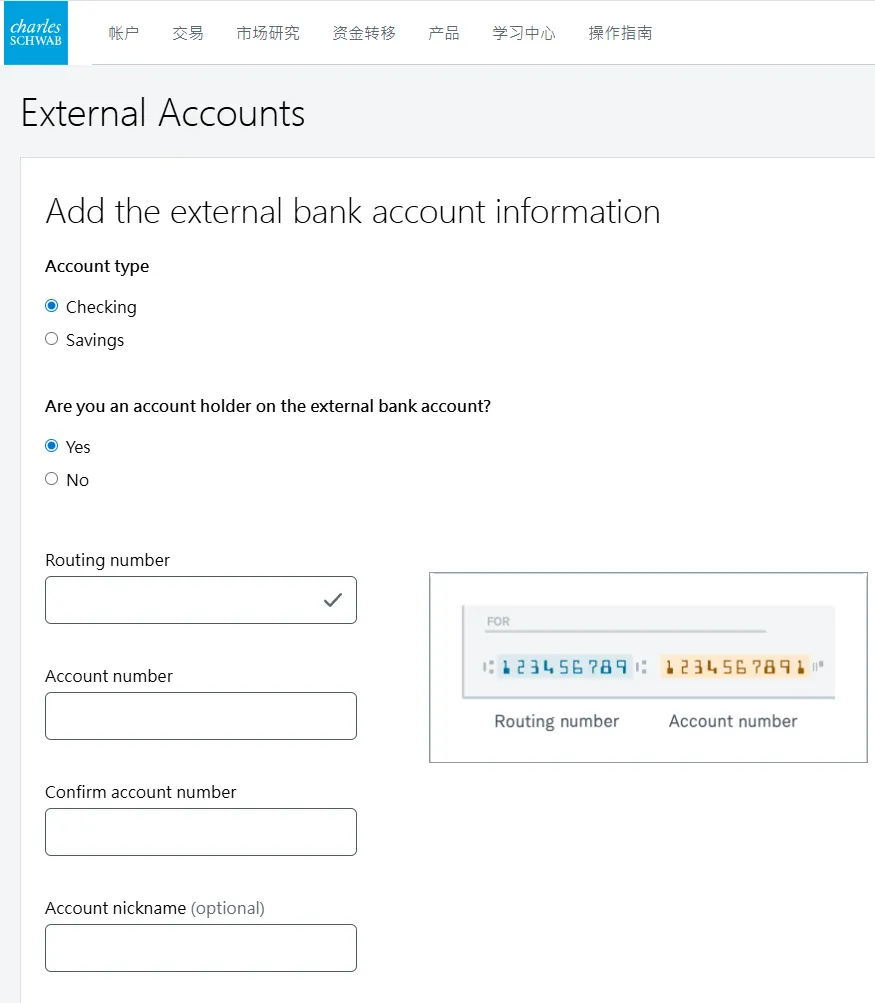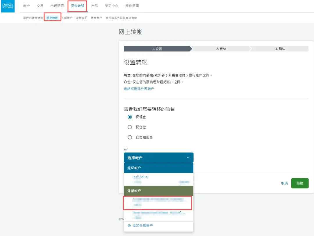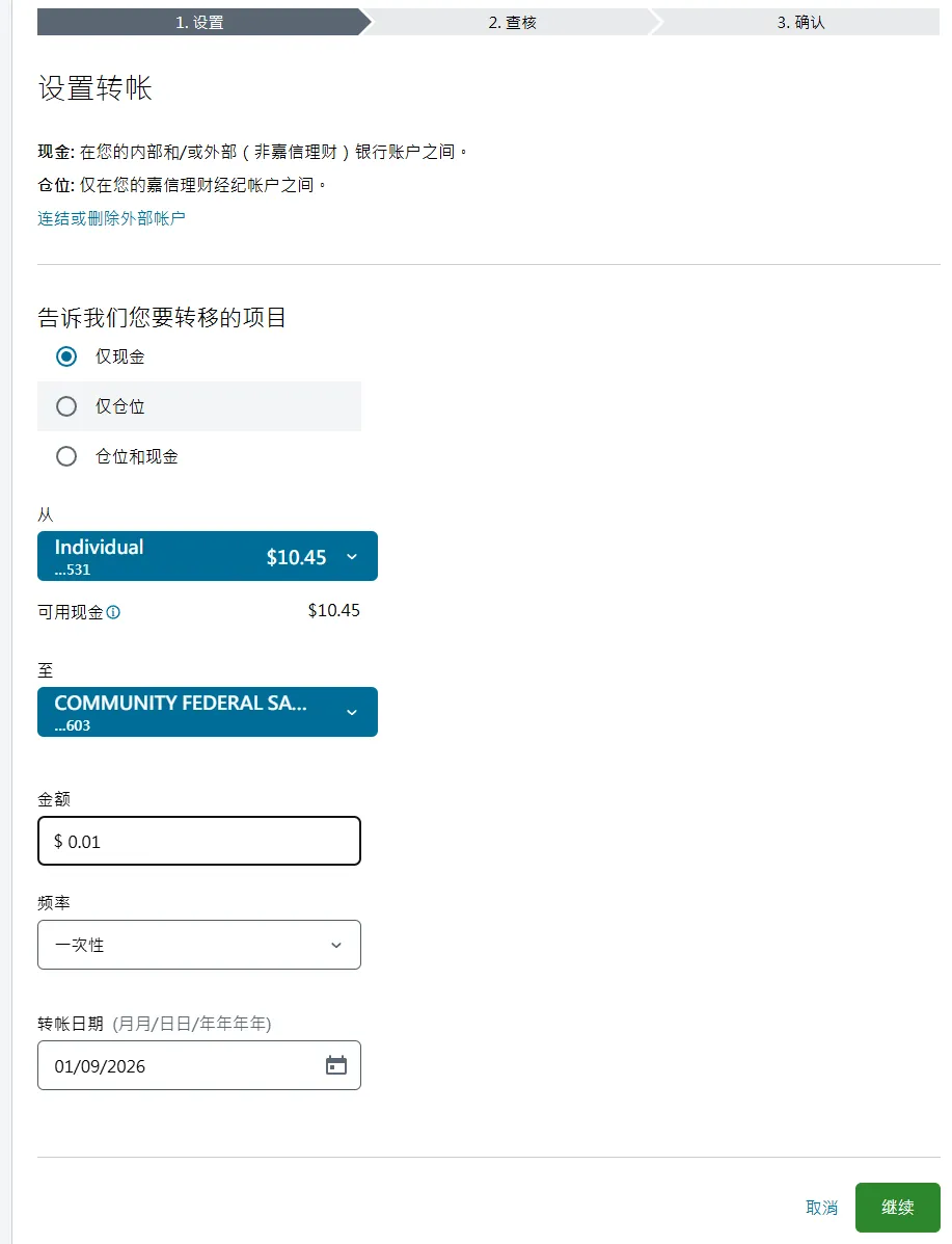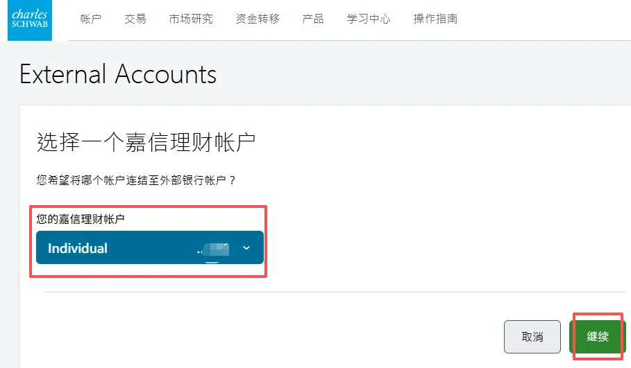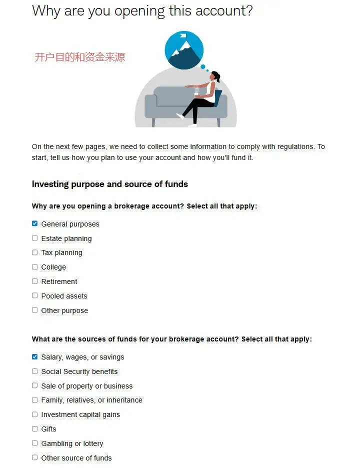 2. 在第二个页面选择账户类型中,选择individual account然后在下一个页面选get started,再然后I agree3. 填写个人资料,点击continue。然后会进入这个输入证件信息的页面,可以选护照,也可以输入身份证,建议选择other government ID,然后输入自己的身份证号。9. 就业情况,这个无所谓。最好别是无业和学生,不然可能期权的权限不给你开,因为期权风险高。12. 保证金账户和期权。保证金账户就是借贷资金功能,建议选上,反正不借钱的话也不会有利息。13. 是否支持TWS交易平台。这是一个嘉信收购的交易软件,功能还挺强大的,建议你开了,反正也不要钱15. 上传证件信息。地址证明用信用卡账单之类的就可以- 有美国银行账户的,使用ACH转账。或者有Wise美元账户的,将Wise绑定到嘉信,然后做ACH转账。