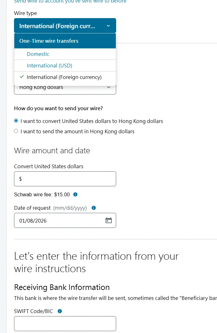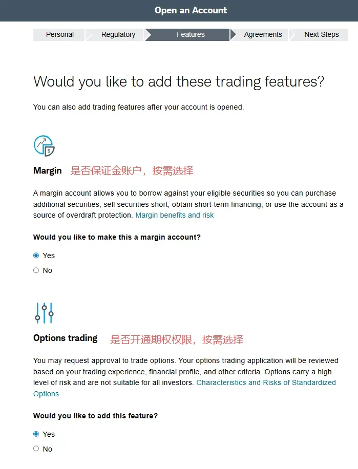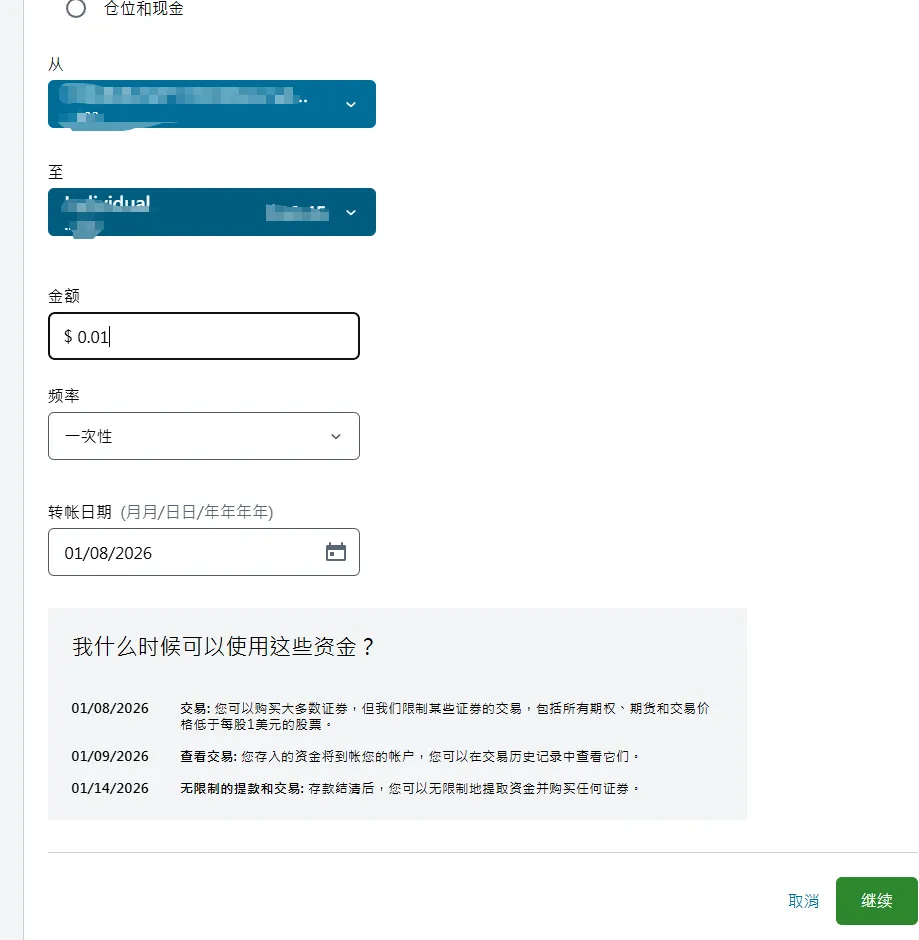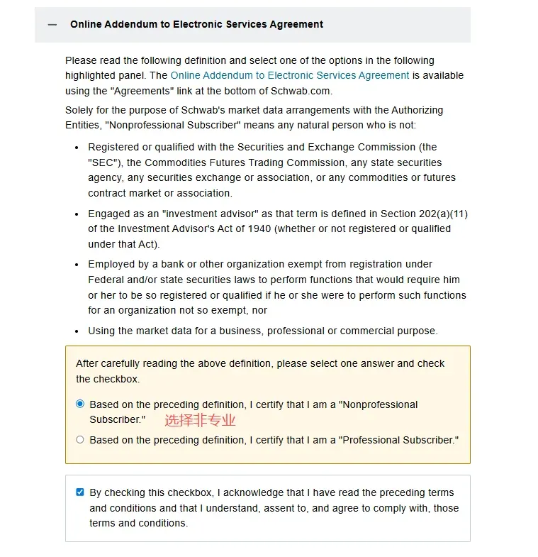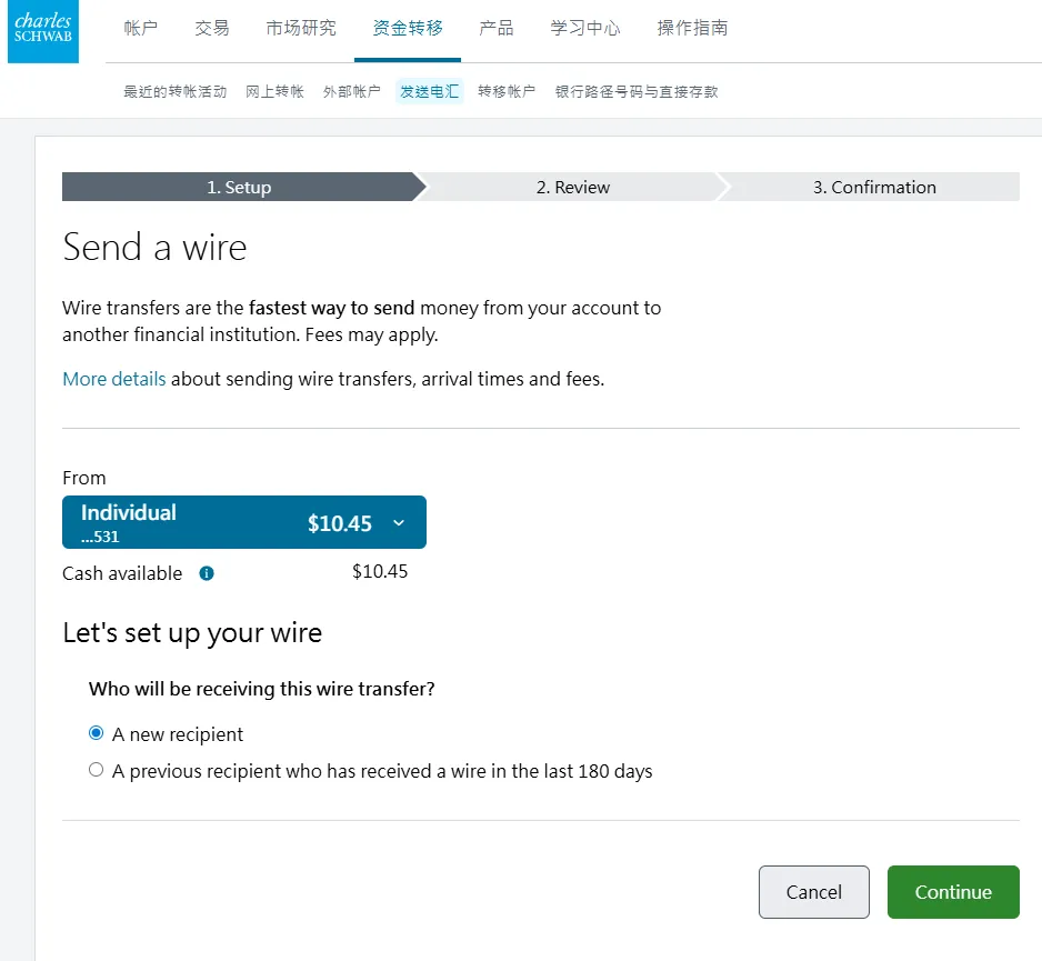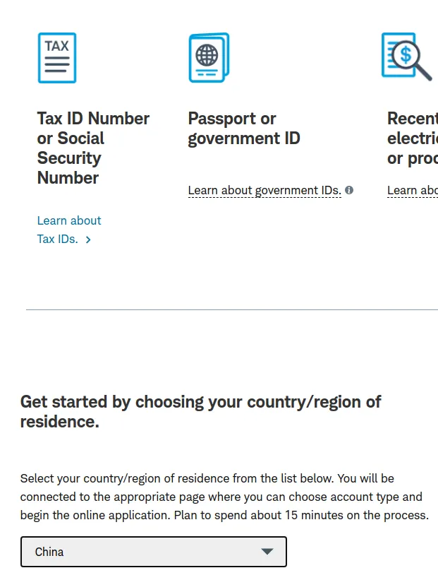 2. 在第二个页面选择账户类型中,选择individual account然后在下一个页面选get started,再然后I agree3. 填写个人资料,点击continue。然后会进入这个输入证件信息的页面,可以选护照,也可以输入身份证,建议选择other government ID,然后输入自己的身份证号。9. 就业情况,这个无所谓。最好别是无业和学生,不然可能期权的权限不给你开,因为期权风险高。12. 保证金账户和期权。保证金账户就是借贷资金功能,建议选上,反正不借钱的话也不会有利息。13. 是否支持TWS交易平台。这是一个嘉信收购的交易软件,功能还挺强大的,建议你开了,反正也不要钱15. 上传证件信息。地址证明用信用卡账单之类的就可以- 有美国银行账户的,使用ACH转账。或者有Wise美元账户的,将Wise绑定到嘉信,然后做ACH转账。