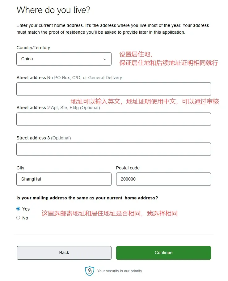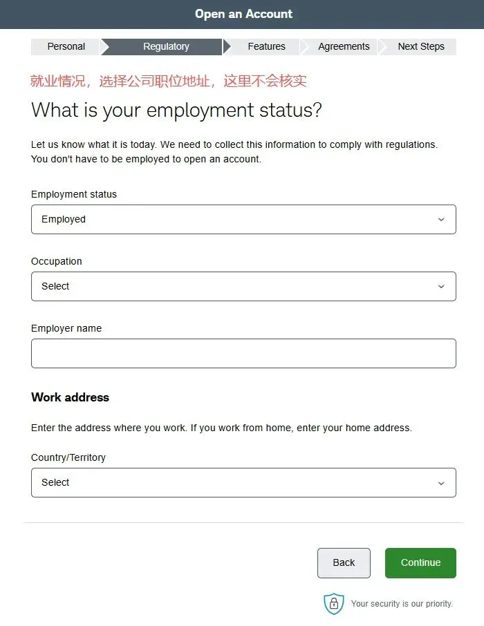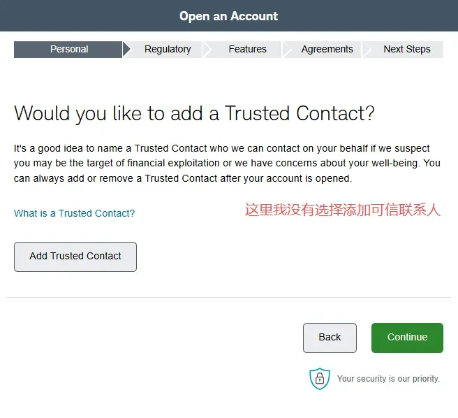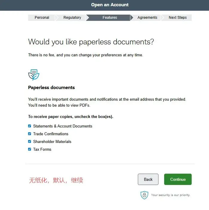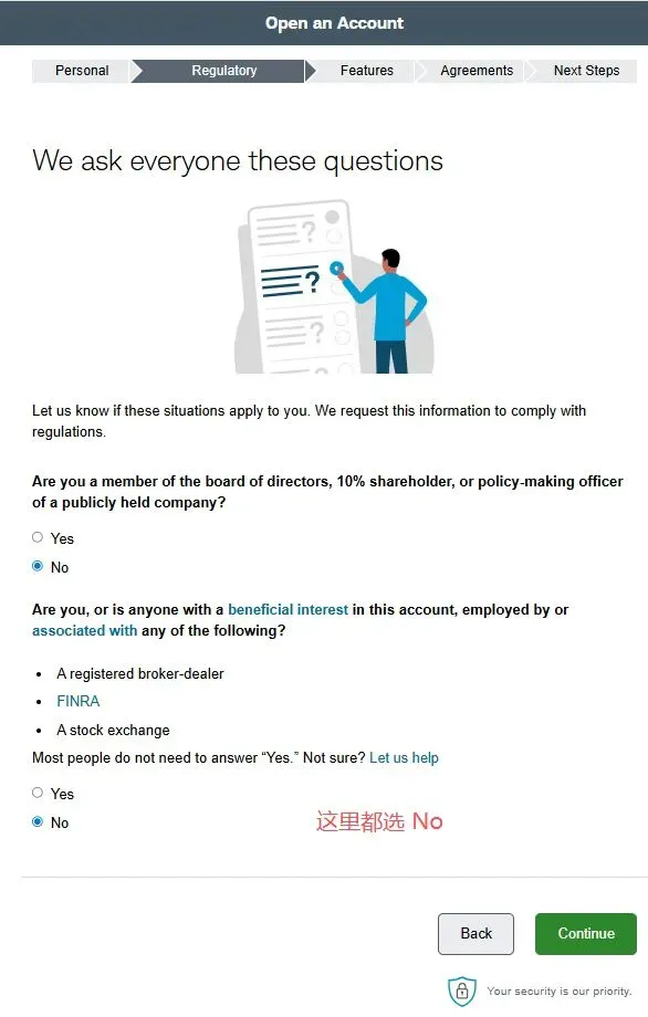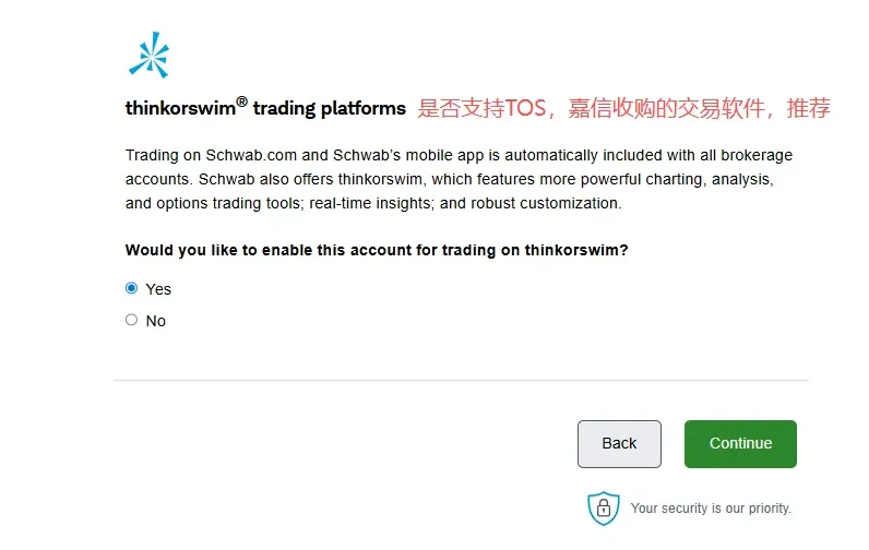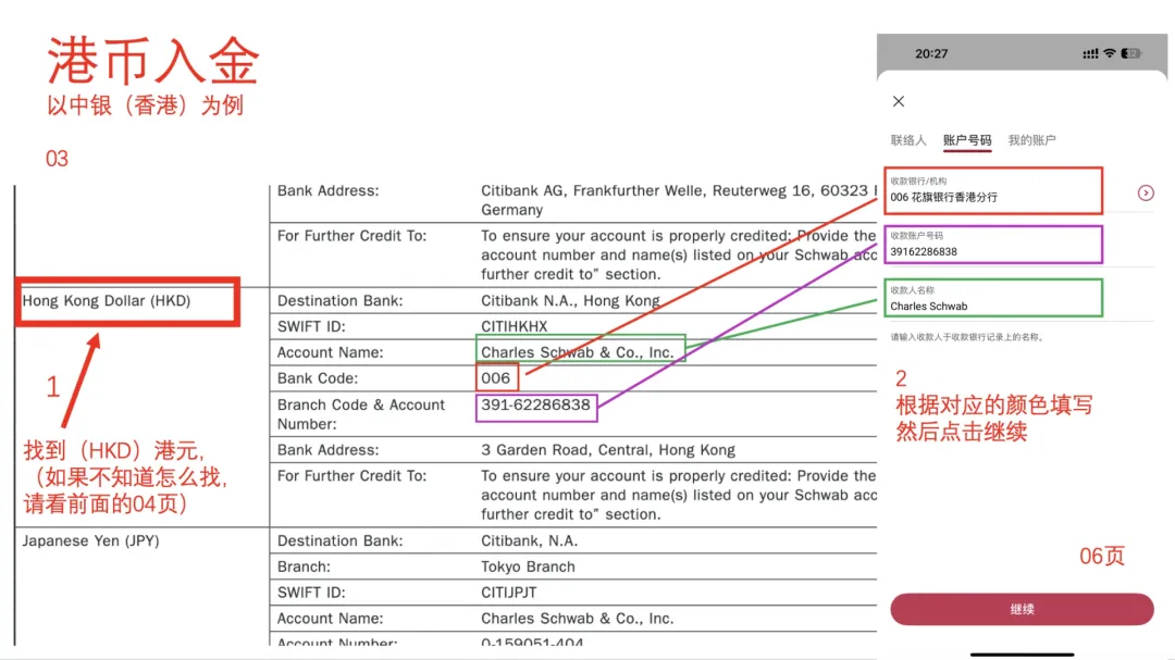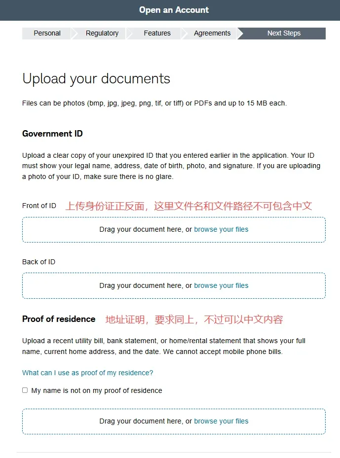 2. 在第二个页面选择账户类型中,选择individual account然后在下一个页面选get started,再然后I agree3. 填写个人资料,点击continue。然后会进入这个输入证件信息的页面,可以选护照,也可以输入身份证,建议选择other government ID,然后输入自己的身份证号。9. 就业情况,这个无所谓。最好别是无业和学生,不然可能期权的权限不给你开,因为期权风险高。12. 保证金账户和期权。保证金账户就是借贷资金功能,建议选上,反正不借钱的话也不会有利息。13. 是否支持TWS交易平台。这是一个嘉信收购的交易软件,功能还挺强大的,建议你开了,反正也不要钱15. 上传证件信息。地址证明用信用卡账单之类的就可以- 有美国银行账户的,使用ACH转账。或者有Wise美元账户的,将Wise绑定到嘉信,然后做ACH转账。