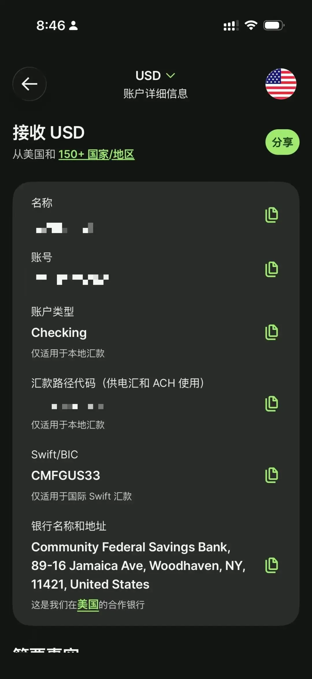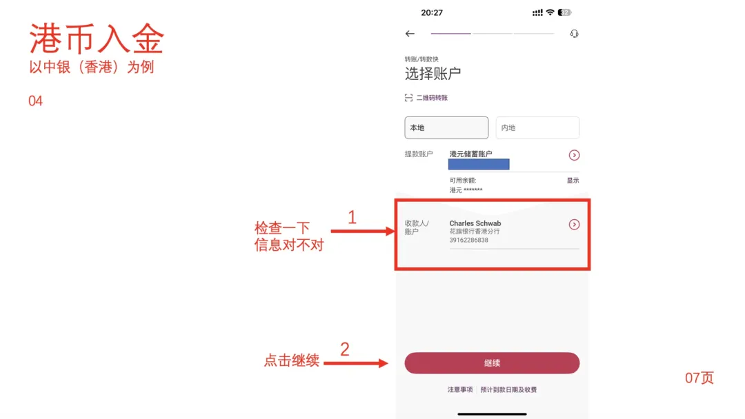 正确选择你的账户类型,以及路由号(routing number)和账户号码(account number)。这些信息可以在Wise的美元账户的详情页看到最终填写完毕后确认,然后2-4天内你的账户会收到两笔小额转账,都是1美元以内的。收到汇款之后,再到这个页面,去填写两笔金额,你就可以绑定成功了。绑定后入金,从资金转移进入,到网上转账,再去选择外部账户,输入金额,最终确认即可。出金可以选择电汇到香港,或者做ACH取款到你的Wise账户。首先演示如何做ACH取款:从资金转移-外部账户,选择你绑定的账号,然后进行转账之后再确认就可以,非常简单。接下来继续展示如何电汇,其实差不多,也很简单。从资金转移进入发送电汇,然后选择对应是新账户还是过去半年内曾经汇款过的账户再去选择币种是美元还是外汇,这里可以选择港币,但是不能选择人民币。最后再去输入金额,以及金额即可。最后还有SWIFT CODE。