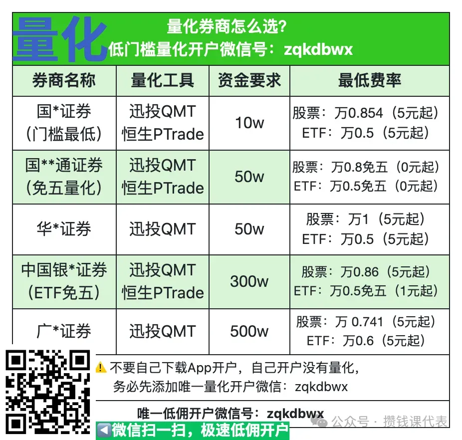 最低入金10万就可以开通迅投QMT或者恒生PTrade,开通方法:请关注公众号【攒钱导师】,回复【量化】。