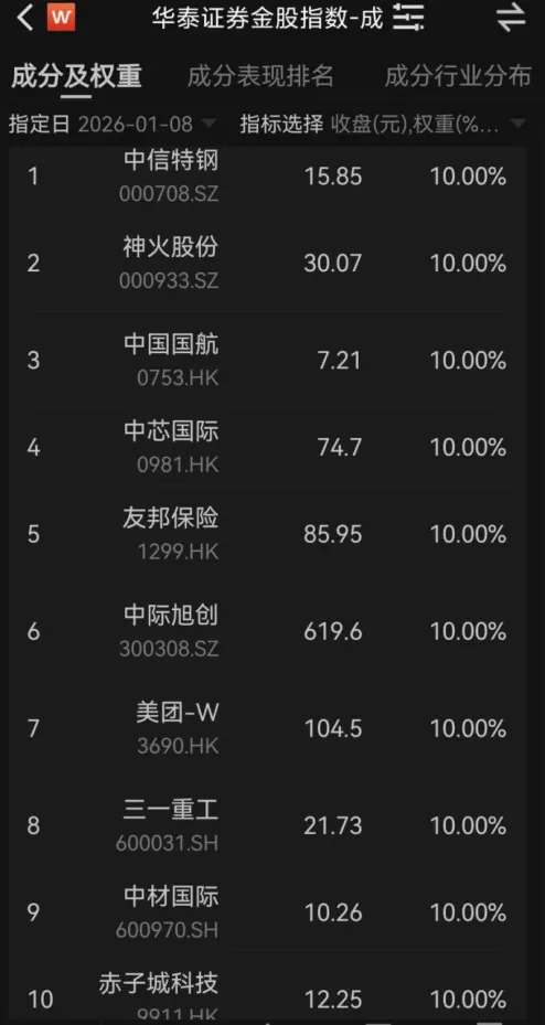 华泰证券金股指数是根据华泰证券每月披露的金股及其表现编制而成,其今年1月的持仓如下: