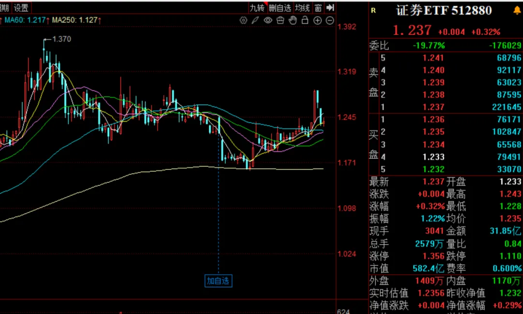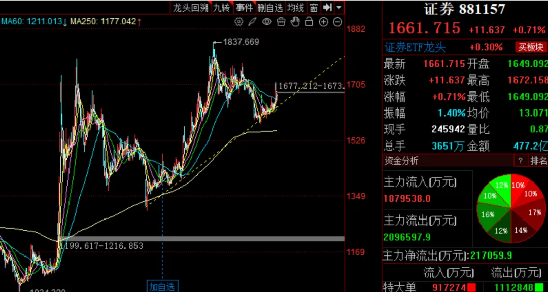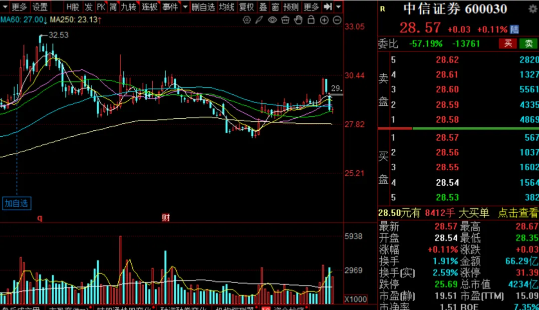 1月9日 券商弱的可怕,大盘强的可怕主要的问题还是热点看不懂,也没有平铺。为下一个牛市积累经验吧。继续守着券商。没什么好去处,去白酒和基建,银行吗?那边的朋友跟我一样呢!说下操作,今天加了两次中信证券,28.6买一次,(28.43买一次,28.56卖出),等于加了一次。大盘涨到4200的时候,中信回到周二的高点就行了。我相信券商还会有一波30%的上涨幅度,这个30%,我至少要拿一半的仓位吃到!现在的券商不涨,完全是被主力带偏的原因,实际利空一个都没有!现在市场成交3万亿了,中信的那点压单,能一直压住吗?大盘的上涨的越多,对券商的拉力越强,券商这个大黄,最终会受不了这种拉力,然后跑到主人的前面去。券商的上涨分两个阶段,第一阶段先突破前期高点,回踩之后,暴力拉升。