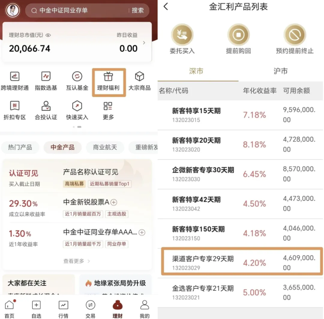 中金财富:理财--福利专区 4.2% 29天 限额2-32万