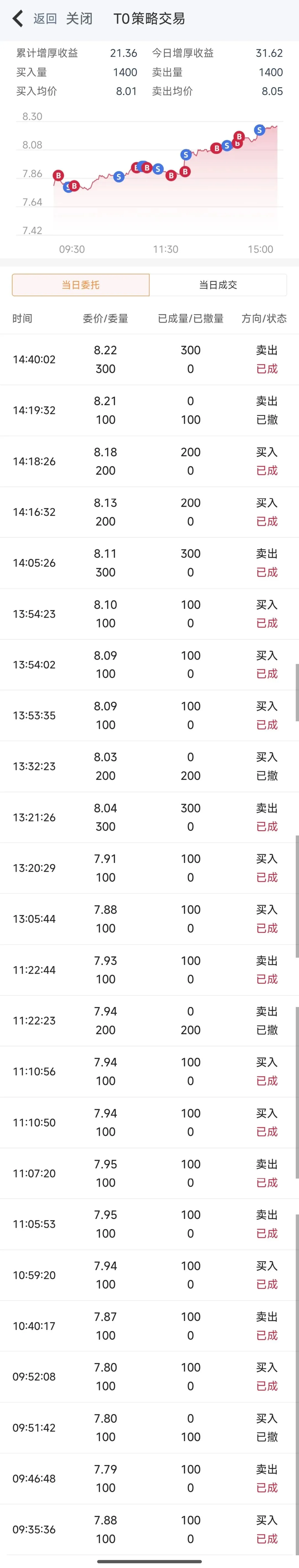 股票买什么都涨,乱成一锅粥了,继续分享券商T0量化操作这几天股票的持续性都非常好,只要一开始不上车,你就只能硬着头皮买入。只要卖出后有新高,几天就拉十几个点。比如我买的这个芯原股份(见最后图片),买点挺好,但是没拿回来就起飞了。下面是今天的券商量化T0操作(跃然)一共赚了60块,很好奇晶合集成最近为啥它不操作了。启能达:因为和林微纳波动大,找了这个给启能达试试水