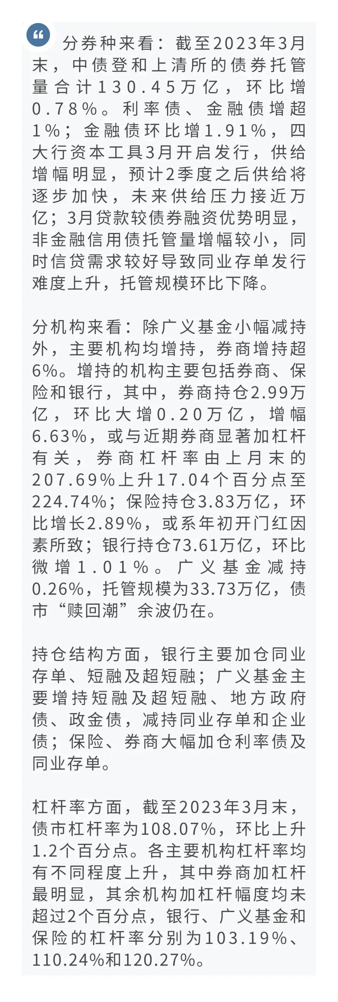 【固定收益】券商加杠杆买债—3月托管数据解读刘星宇 兴业研究分析师顾怀宇 兴业研究分析师鲁政委 兴业银行首席经济学家 华福证券首席经济学家如需查阅研报完整版内容,请下载兴业研究APP点击“阅读原文”下载注册兴业研究APP,获取更高研报阅读权限