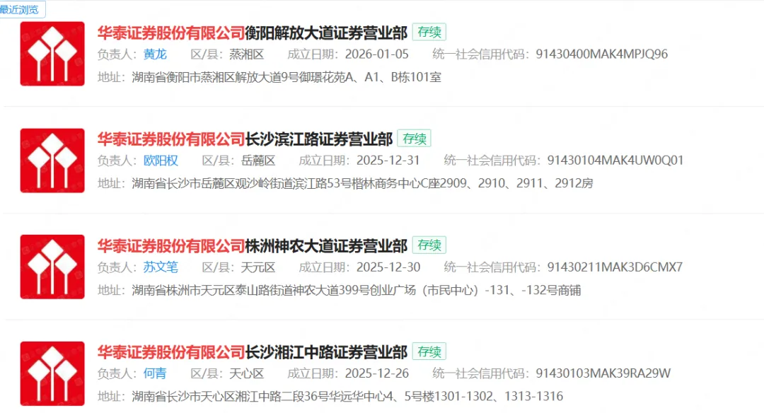 而从2025年最后一周开始,短短半个月内,华泰证券已有四家新设网点,并且均位于湖南省内。这也是华泰证券自2009年以来,时隔17年再度在湖南区域设点。
