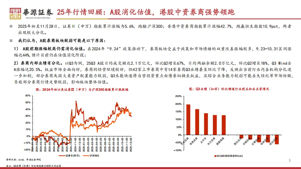 2025年的资本市场呈现出一种奇特的拉锯状态,如果你只盯着A股看,可能会觉得证券板块走得有些偏弱。从2025年初到11月28日,证券II(申万)指数累计只涨了5.6%,这个数字不仅没跑赢沪深300,甚至让不少持股的股民感到焦虑。另外香港中资券商指数却明显走强,累计涨幅达到42.7%,跑赢恒生指数10.9个百分点。这种AH股行情的剧烈分化,根源在于2024年那波“9.24”政策后的暴涨还没消化完,A股券商在2024年9月底到10月底一个月就涨了44%,目前显然还在还债。