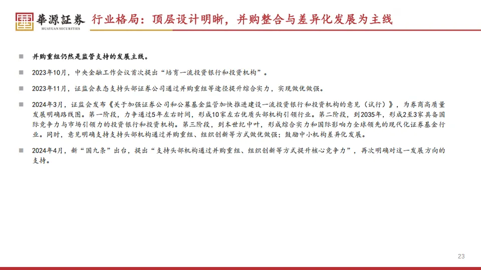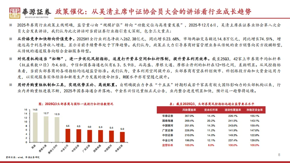 这种差异背后反映的是监管思路的变化。证监会吴清主席在证券业协会大会上明确提到,要对优质机构适当“松绑”,优化风控指标,适度打开资本空间和杠杆限制。目前中国头部公司的杠杆率只有6倍左右,而高盛、摩根大通这些国际巨头的杠杆通常在12到15倍。如果后续杠杆空间真的打开,中信、国君这些头部机构的ROE还有很大的提升空间。