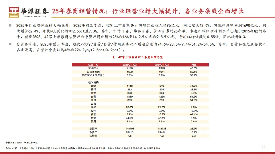 但行情弱并不代表赚钱能力差。华元证券梳理的数据显示,2025年前三季度,42家上市券商合计实现的营业收入达到4196亿元,同比大涨43%,净利润更是飙升62%至1690亿元。全行业的年化ROE(净资产收益率)从去年同期的4.8%提振到了7.3%。这意味着,虽然股价在震荡,但公司的基本面已经发生了很大的变化。具体到业绩表现,中信、华泰、长江等公司的三季度单季净利润甚至超过了2015年那个大牛市的高点。这种估值与业绩的不匹配,正是2026年看好这个板块的核心逻辑。
