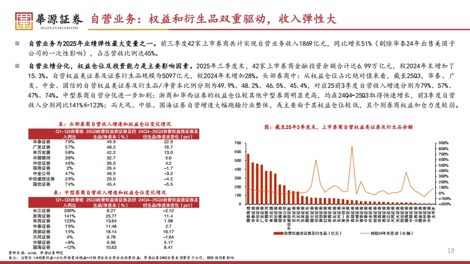 在券商的所有业务条线里,自营业务已经坐稳了收入的头把交椅。2025年前三季度,自营业务收入达到1869亿元,占总营收的比例高达45%。能不能赚到钱,全看各家公司在权益仓位上的切换速度。三季度A股日均成交额冲到了2.1万亿元,环比翻了半倍多,Wind全A指数单季也涨了20.5%。