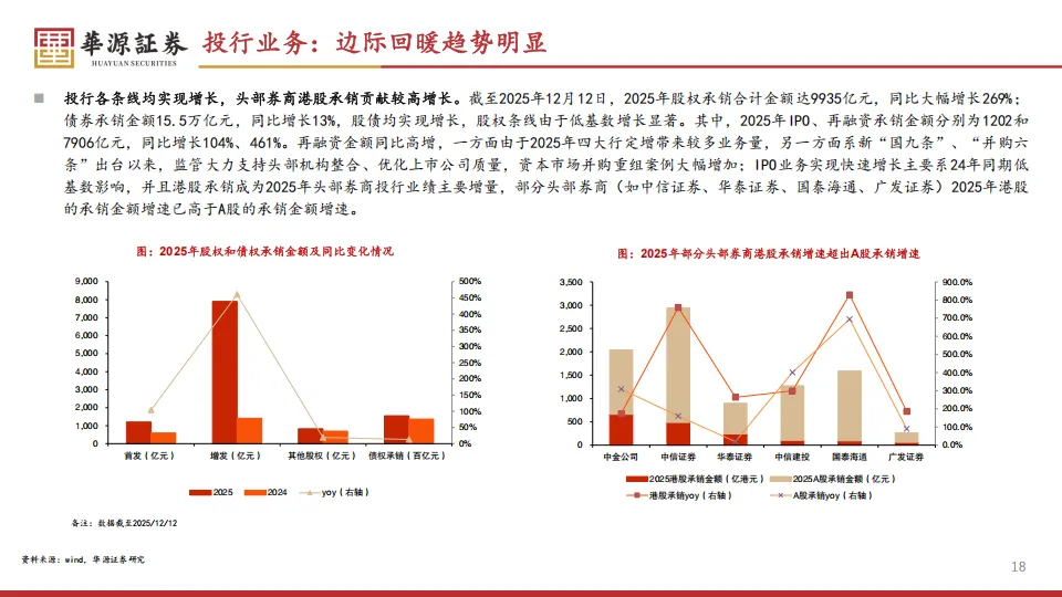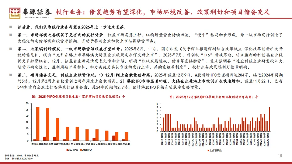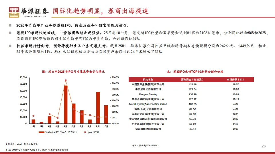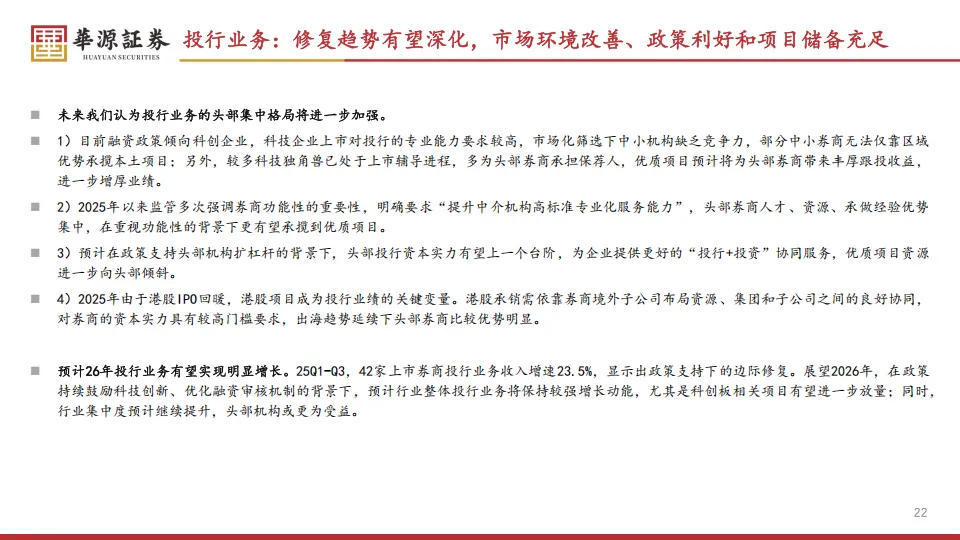 投行业务在经历了过去两年的阶段性收紧后,终于在2025年迎来了明确的复苏转折。2025年前三个季度,42家券商的投行净收入逐季提升,三季度单季增速已经达到33%。这次复苏的火种来自两个方向:一是科创板的“1+6”新政,给未盈利的科创企业开了大门;二是港股IPO市场的爆发,前10个月港交所募资金额同比增加202%。