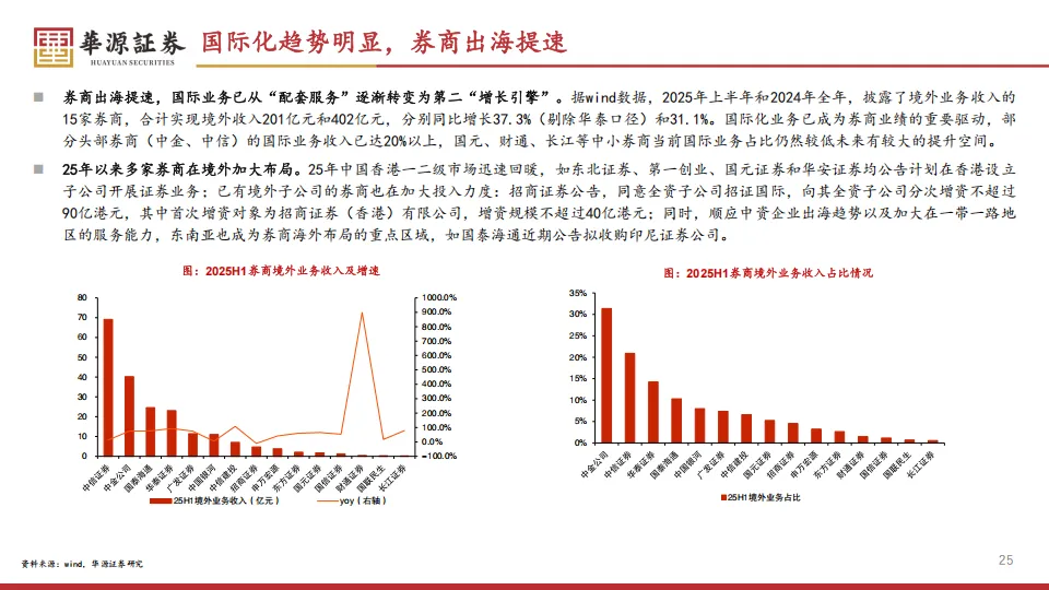 国际化是实打实的业绩增量。2025年上半年,披露境外业务收入的15家公司合计收入201亿元,同比增长37.3%。中金和中信的国际业务收入占比已经超过了20%。东南亚成了海外布局的重点,国君甚至公告拟收购印尼的公司。