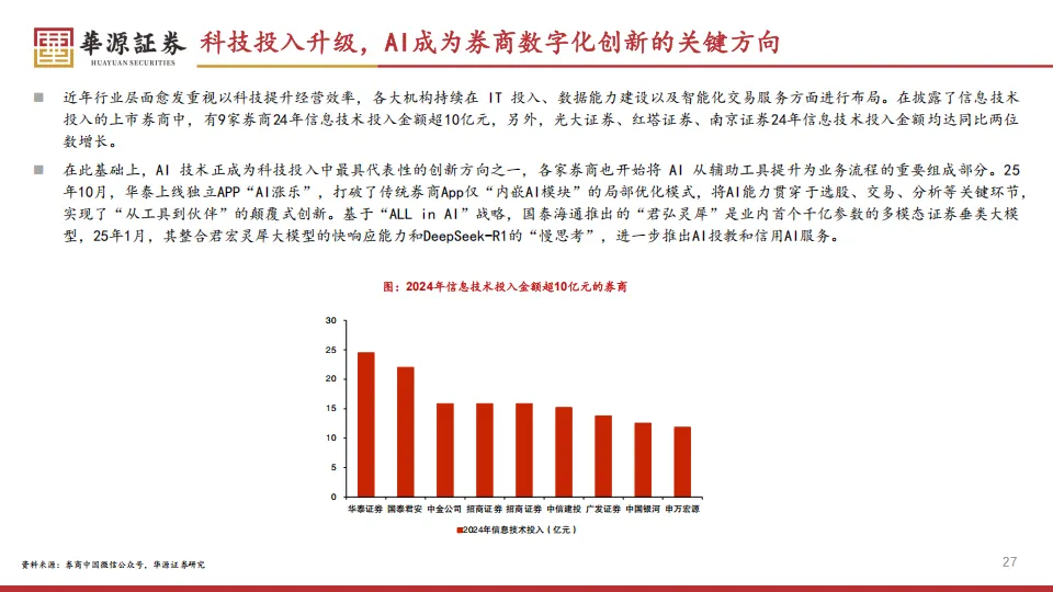 另外AI正在重塑券商的服务模式。华泰上线了独立的“AI涨乐”APP,直接把AI能力贯穿到选股和分析的每一个环节,不再只是以前那种内嵌的小模块。国君推出的“君弘灵犀”大模型,整合了DeepSeek-R1的思考能力,在AI投教和信用服务上走在了前面。对于普通投资者来说,这意味着你以后面对的可能不再是冷冰冰的交易软件,而是真正的智能陪护投顾。