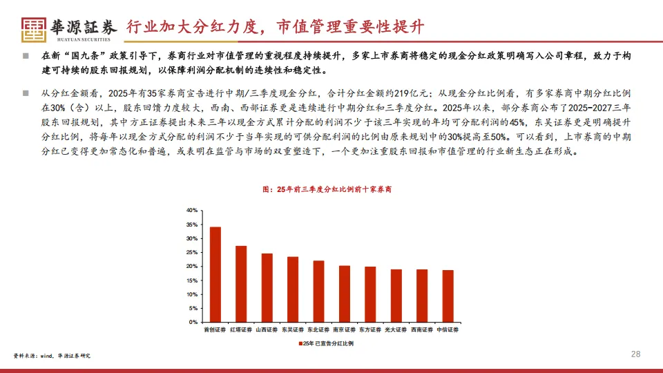 现在的券商开始学会在股东身上下功夫了。在新“国九条”的指引下,市值管理被放在了更重要的位置。2025年有35家券商宣告了中期或三季度分红,分红总金额约219亿元。西南、西部甚至是连续在二、三季度直接发钱。
