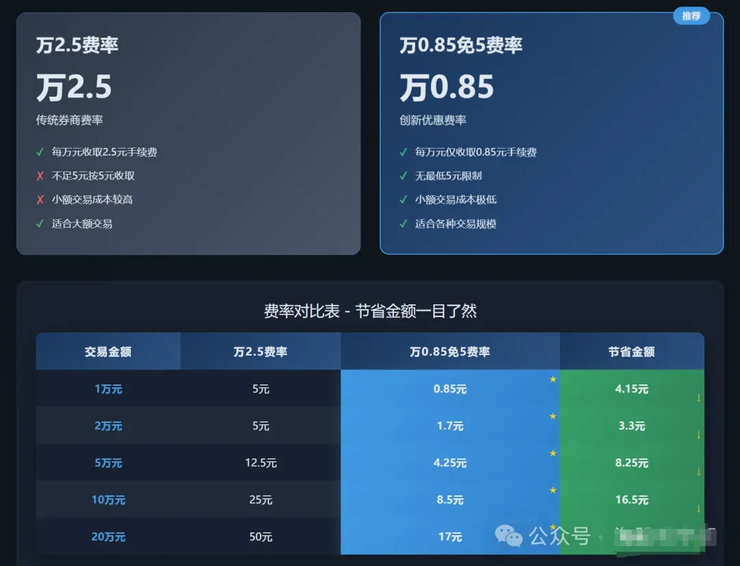 万一免五就是手续费按万分之一收取,万0.85免五就是佣金按照万分之0.85收取,并且免除5元最低收费。举个例子,如果你有50万,一次交易就节省82.5元。