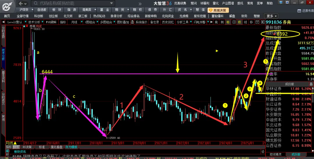 “牛市旗手”、券商的2026券商作为“牛市的旗手”、作为资本市场的重要参与者,券商的表现常被视作市场情绪的“风向标”。2007年、2015年等牛市周期中,券商券商表现均远超大盘,受到投资者的“赞誉”,但在2018、2019年的表现却令人唏嘘遭到市场的吐槽,从此被被戴上“股市渣男”、“股市搅屎棍”的骂名,那么如何看待“牛市的旗手”券商在2026年的表现?一、券商目前处在“3浪5”的上涨之中,见图一图二。1、月线上,券商自2015年9263开始的调整呈现的是“abc”的结构,压力位在6444的位置。需要说明一点------券商的6444这个压力位相当于上证指数的3685的压力位,这是一条重要的压力位、见图三。2、2021年,大盘在突破3685、见到3731后出现调整、并在2025年再次突破3731、表现远强于券商、见图三,而券商目前依旧还在6444这条压力线的下方运行、等待向上的突破。3、技术上,券商目前处在“大三浪”的上涨之中【备注:红色箭头部分】,严格意义上说券商正处在“大三浪”中的“3浪4”的调整之中,接下来将会进入到“3浪5”的上涨【备注:黄色箭头部分】。4、券商“3浪5”的上涨理论上应该在见到8392后完成【暂定】,也就是说券商“3浪5”的上涨将是一次向上突破6444、挑战前高9264的过程,2026券商大致有3000点的上涨空间、是值得期待的。5、次轮上涨应该是一场跨度10年的“超级牛市”【备注:2018至2028】,目前也仅处在“大三浪”的上涨之中,未来还应该有“大四浪”的调整以及“大五浪”的上涨,作为“股市旗手”的券商我们认为在未来“大五浪”的上涨过程中将会有出色的表现【备注:2025、2026券商目前还处在摆脱底部束缚过程】。6、2025年,A股市场持续回暖,前三季度A股成交额合计达301.56万亿元,创历史同期新高。市场活跃度的提升,为券商业绩提供了有力支撑,经纪、投行、资管和投资收益均实现正向增长。7、尽管业绩亮眼,但券商板块的估值却仍处于历史低位。截至2025年11月,券商板块PB为1.52倍,处于历史相对低位。主动型基金重仓股中券商板块占比为0.86%,相对A股低配3.21个百分点,机构持仓位于历史低位。8、2026年券商板块应该会从“资产重估”阶段进入“盈利修复”阶段。免责声明:文中数据来自公开信息整理,不保证内容完整性与时效性,所有观点均不构成投资建议,分析结论仅供参考。入市有风险,投资需谨慎!。