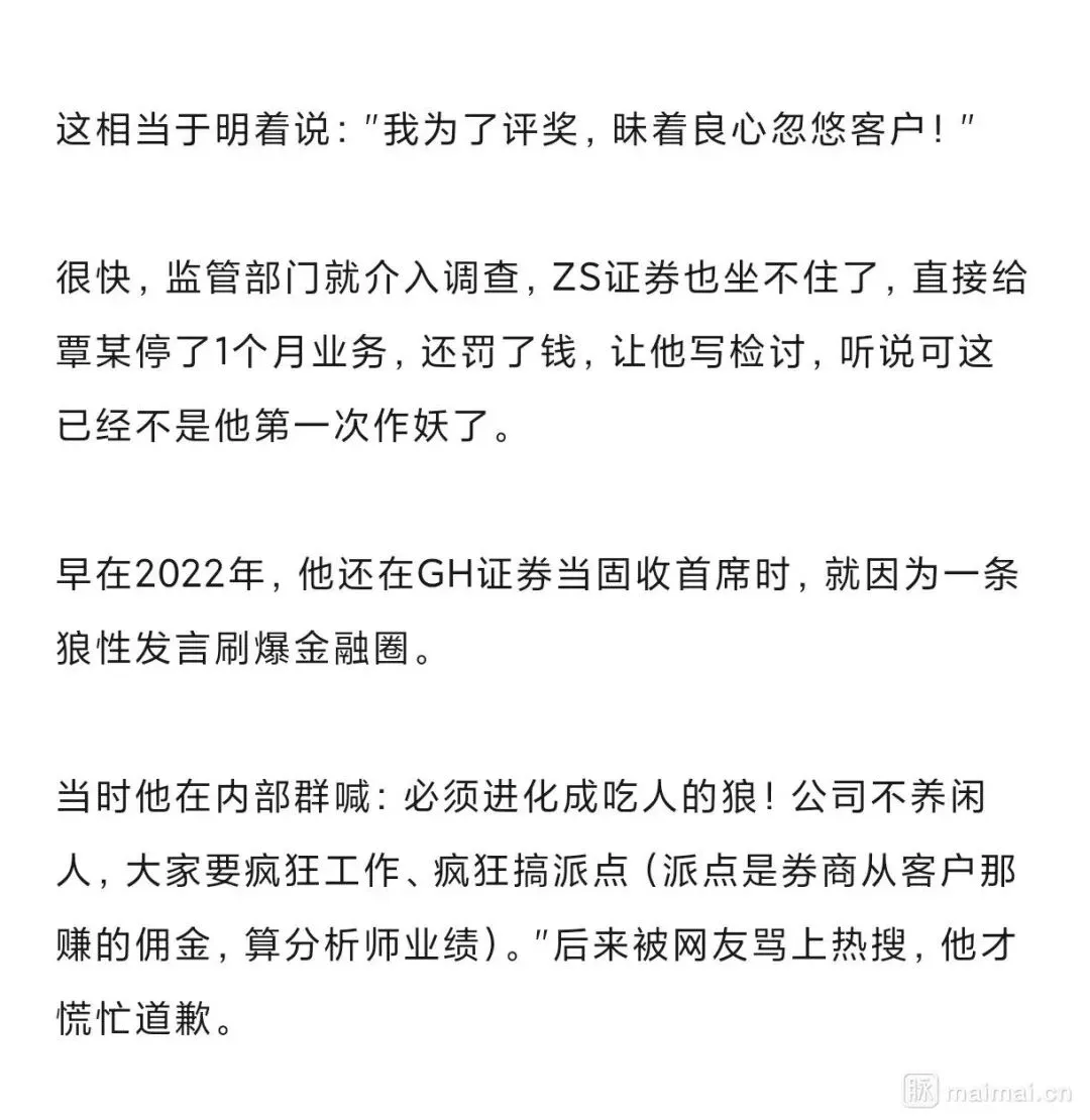券商固收首席自曝为冲排名故意不翻空 监管介入调查遭停业罚款近日,金融圈被一则自曝内幕的朋友圈搅动。某券商固定收益首席分析师覃某,在2025年某最佳分析师评选结果公布后,于朋友圈发文表达不满。 其团队在本次评选中获得第五名,但他自称目标是进入前三。更令人震惊的是,他自曝为了拉票,在三季度市场本应看空时,他故意没有提示客户转向,而是继续维持原有观点,"昧着良心忽悠客户"。 此言论迅速在业内传播并引发轩然大波。* 监管火速介入:相关监管部门已对此事展开调查。* 所在券商严惩:其供职的ZS证券迅速做出反应,对覃某采取了暂停其业务权限1个月、进行经济处罚并责令其深刻检讨的内部处理措施。据悉,这并非覃某首次因争议言论进入公众视野。早在2022年,其在另一家券商任职时,就曾因所谓的"狼性发言"而被推上舆论风口。#券商丑闻 #分析师评选 #职业道德 #金融监管 #固定收益