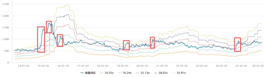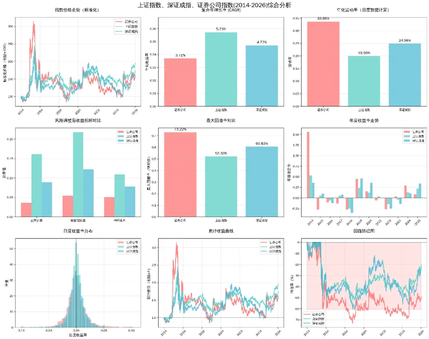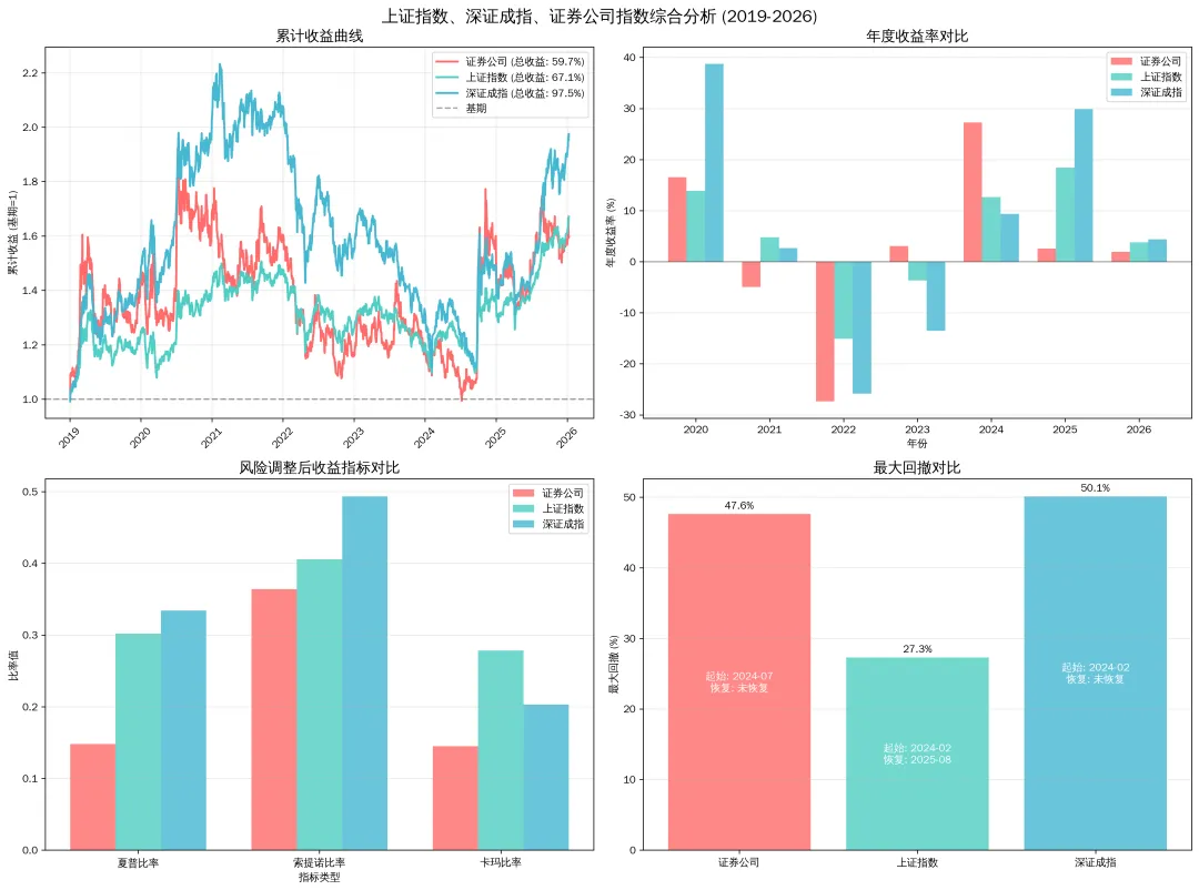 喜欢玩券商的投资者很多看中的是券商的弹性,要么不涨,涨的时候一波流带走,属于强贝塔属性(2014/1/2-2026/1/9期间全周期贝塔约1.38,强势年份接近1.6-1.7),而渣男的本质从数据中可以更清晰的看出:表格中数据分别从2014年(左)和2019年(右)开始计算