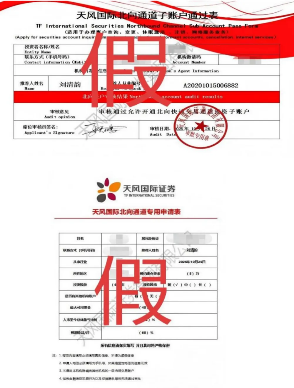天风证券发现,有不法分子假冒天风国际工作人员与投资者签署“天风国际北向通道子账户通过表”“天风国际北向通道专用申请表”,声称协助投资者开通天风国际北向通道子账户,且表中使用假冒的天风国际印章。