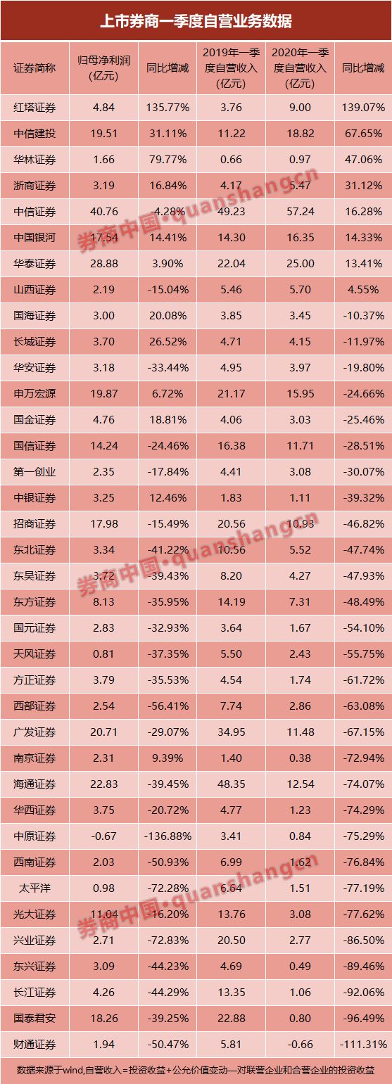 一季度,在疫情和外围股市暴跌双重影响下,A股出现大幅波动,给各大券商自营业务带来艰难考验,最终大部分券商表现不尽人意。