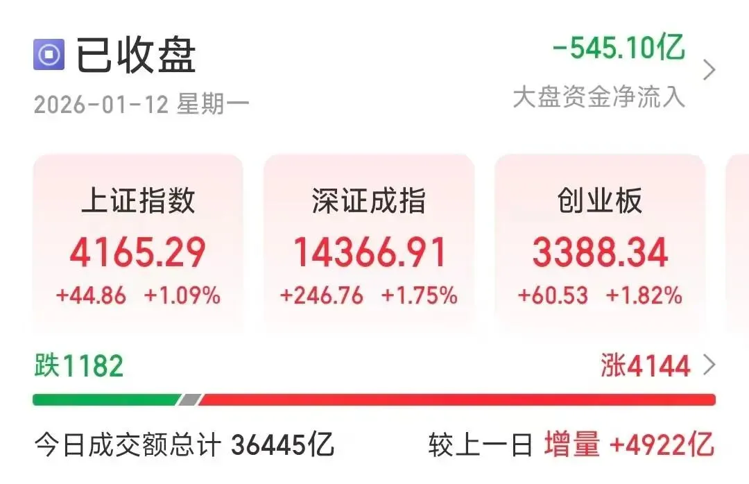 在沪指走出17连阳行情的同时,截至1月12日收盘,沪深两市成交额也达到3.6万亿元,较上一个交易日放量4787亿,刷新成交额历史纪录。截至收盘,沪指报4165.29点,涨1.09%;深证成指报14366.91点,涨1.75%;创指报3388.34点,涨1.82%。专家认为,连续两个交易日突破3万亿元,表明市场已进入量价齐升阶段,春季攻势已经展开。
