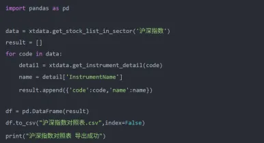 上面我们已经获取了指数代码列表,但为了清晰地了解每个代码对应的具体指数,我们需要同时获取指数名称。以下代码将指数代码与名称对应起来,并保存到CSV文件中以便查阅: