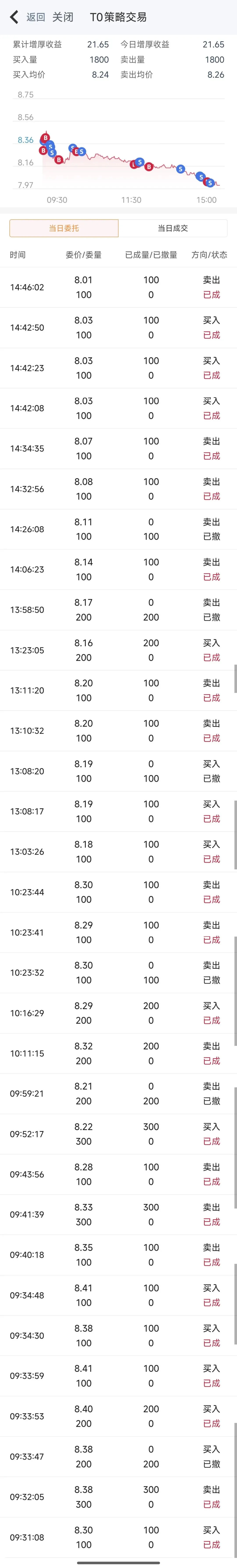 券商T0在单边行情中“阴跌和慢涨”都能多赚一丢丢丢钱最近观察了几天天我中兴通讯的券商T0操作,如果算八万本金,跌了五个点,能有千分之三的超额收益,长期坚持并且所选波段股票走势不是一直下跌,这个收益按照年算是可以少亏一点点,只能算安慰奖。他对于我的作用就是在我不操作不看盘的时候有一点点安慰。如果长期持股,还要吃股息的票来说,减亏的比例不一定比多交的分红税高。那种股票使用还需谨慎。慢慢熟悉T0的用法。这两天的行情有点大起大
