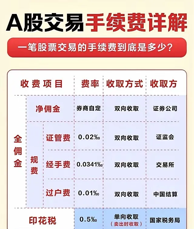 投资者通常所说的“佣金”实则是“全佣金”,由两部分构成:券商收取的“净佣金”和代为收取的“交易规费”。交易规费包括经手费、证管费和过户费,这些是固定成本。