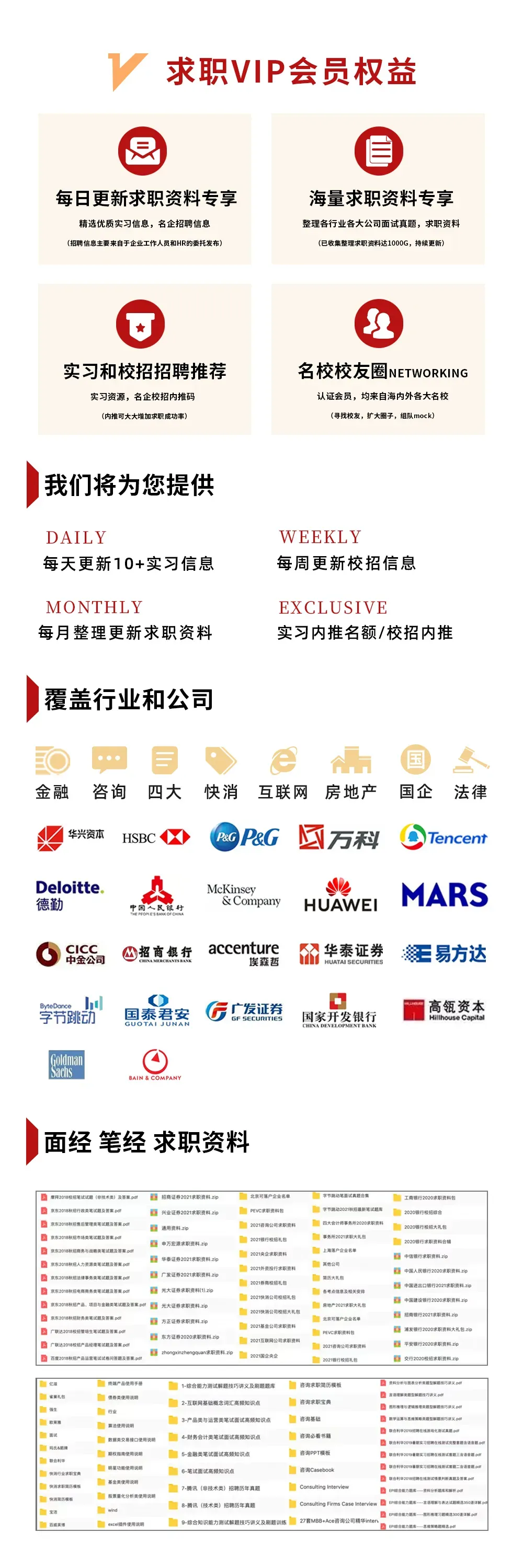 2.每周:我们会定期整理,寒暑假实习信息汇总表、远程实习信息汇总表、春招/秋招网申汇总表、国家部委招聘信息等等,每周第一时间分享到VIP会员群!部分展示如下👇