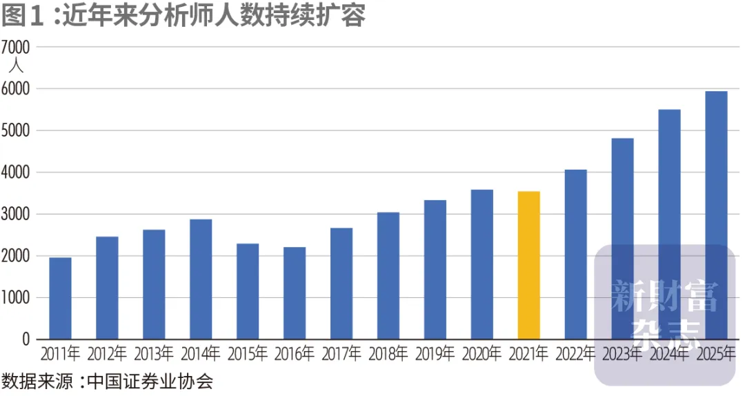 这一背景下,2025年,证券分析师人数一度逆势突破6000人,年末稳定在5889人,较5年前有了近七成的增长。