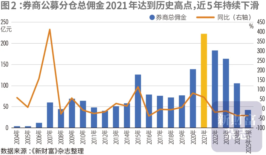 2025年上半年,券商分仓佣金收入为44.58亿元,较上年同期的67.74亿元下滑34%,较2021年的最高点更是打了四折(图2)。中信证券、广发证券、长江证券等券商2025年上半年分仓佣金同比降幅均超30%。
