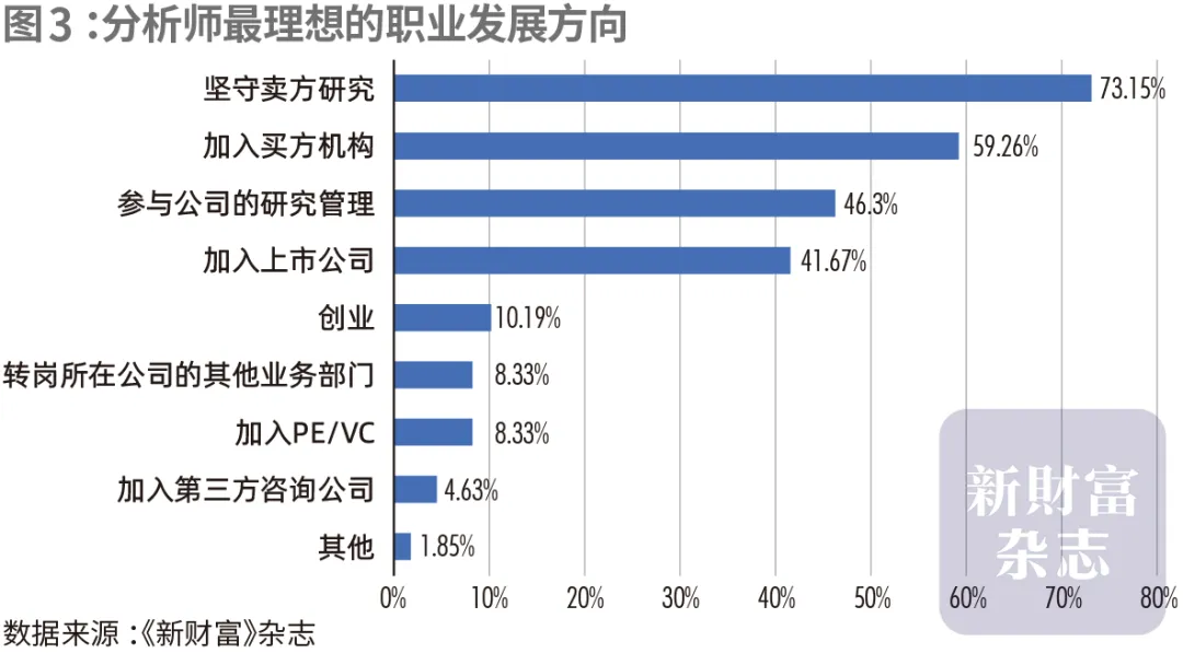 在《新财富》杂志2025年对分析师的调研中,“坚守卖方研究”依然是分析师最理想的职业发展方向,选择比例达到了73.15%;加入买方机构的选择比例居第二,达到59.26%。此外,参与公司的研究管理、加入上市公司等选择的比例也超过了40%(图3)。