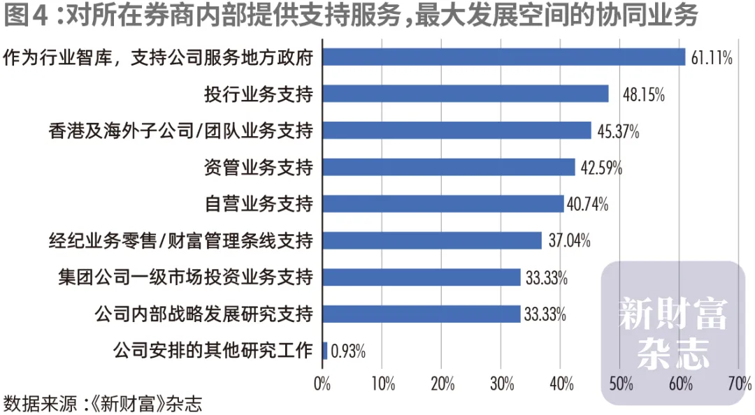在《新财富》杂志的调研中,当被问及“对所在券商内部提供支持服务,获得最大发展空间的协同业务”时,“作为行业智库,支持公司服务地方政府”的选择比例居第一,达到了61.11%,投行业务、香港及海外子公司/团队业务、资管业务、自营业务支持的比例也均超过了40%。这一结果也印证了券商研究的智库化、国际化发展趋势(图4)。