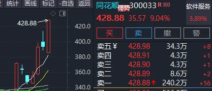 十点附近,同花顺放量拉升,历史新高,超过2025年的股价,比东方财富盘子小,恒生电子涨停,飞天诚信,四方精创,银之杰等拉升