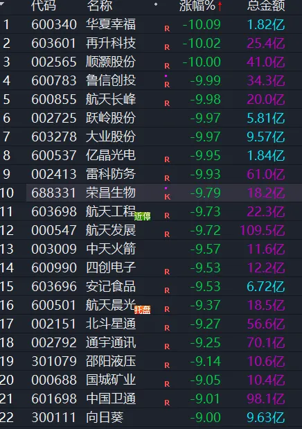 航天资金流出,,瞎炒的 见顶就没人来了。。