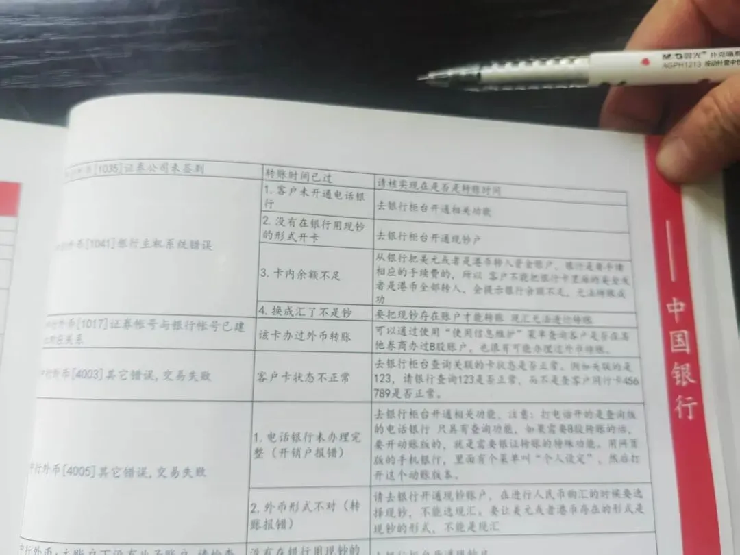 下午再次来到券商营业厅,客户经理远程电话指导业务经理要怎么开通B股转账账户,不出意料这次又失败了,问:什么原因?答:不知道,正在查(见图三,现场查手册😂),没查到,于是打电话到总部询问,半小时后给答复说是银行报错,要咨询银行,报错代码:1101(见图四),于是我打电话给银行客服,客服告知前提条件是已在证券公司完成B股保证金账户的开户(不知道是不是前面开通的B股转账账户),于是券商这边客户经理又是一通询问总部,又等了半小时后告知还是要找银行处理,这个报错代码是银行这边的。于是我又打电话给银行客服,客服告知她这边没有权限查这个报错代码的原因,于是给了线下网点的电话,我又拨通了银行线下网点的电话,线下网点这边的工作人员告知要带券商给的红章协议文件(需要客户和三方签字)、身份证、银行卡到柜台查询,于是让券商客户经理申请这个协议文件,她也反馈给公司了。于是只能回去待协议文件申请ok了再去银行网点办理,灰溜溜跑回去。😮💨