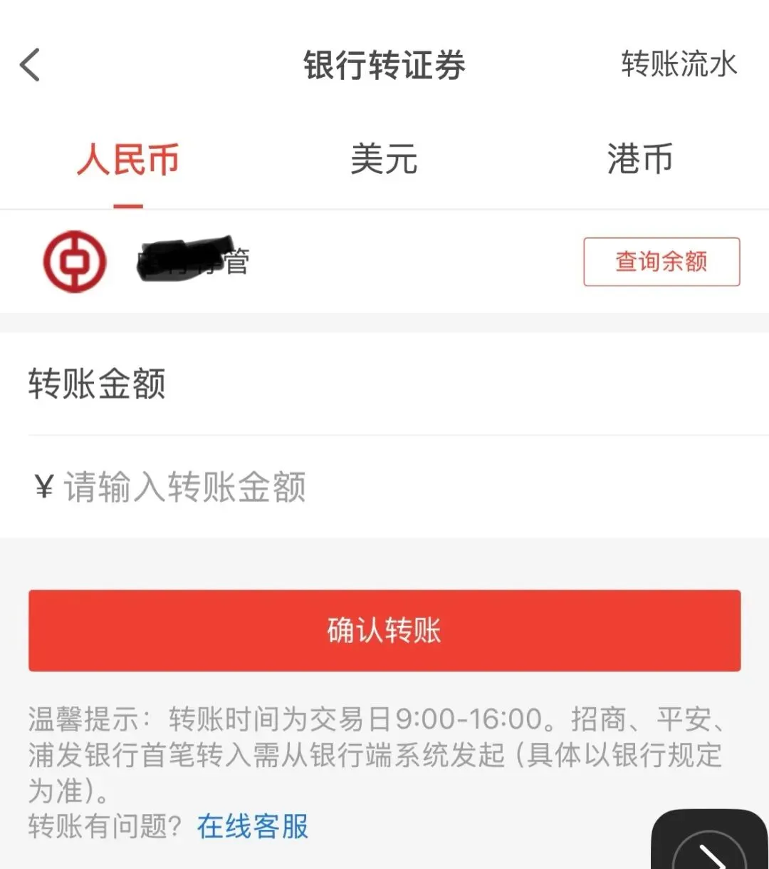 于是又来到银行网点,一到大堂就跟昨天给我办理业务的工作人员说:你昨天给我办的业务搞错了,扯了几句后知道他们不懂这是个啥业务,于是让他给我约一个柜台的号,我直接到柜台办理。等快排到我的号时,我再次拨通了银行客服的电话,并要求转给他们领导,因为我担心银行柜台的人也不了解这个业务,而我也不懂,怕出现昨天的鸡同鸭讲导致业务办错,于是想借助他们客服领导的力量促成这个业务的正确办理,跟客服领导简单说明诉求后,她表示没有问题,电话保持不挂断。等了一会排到了我的号,我把诉求再次跟柜台工作人员说明了,柜台的工作人员果然不知道这个报错,担心自己没说清楚,于是让线上的电话客服又跟他说了一遍,柜台工作人员还是不知道怎么回事,在喊他们领导过来。同时我让他帮我把电话银行动账版功能先开通,这个业务很快办好了,我同步把这个信息同步给了券商经理。一会银行领导过来后说B股银证转账业务的开通不需要银行参与,1101这个报错他们也查不到是什么原因,于是我想让券商那边的客户经理跟银行领导这边直接对线,于是跟线上的银行客服说先挂断了。拨通券商客户经理电话后,客户经理跟银行领导说:这个报错是银行这边给的,没有报错内容,银行领导还是表示这个报错他们处理不了,因为他们系统中就没有关于B股的相关业务办理入口,并且让券商这边查下他们办理B股银证转账业务时在系统中选择的现钞还是现汇(这里埋了一个伏笔[捂脸哭]),券商客户经理这边把电话挂断后去确认了。一会券商客户经理说后台把流程重新触发一遍后成功了,让我在券商APP上确认下,于是快速打开APP查看,确实有B股相关入口了(见图五),至此,我以为一切都OK了,就等转账了。因为已经中午了,剩下的事情跟银行这边没关系了,所以赶回去吃饭了。