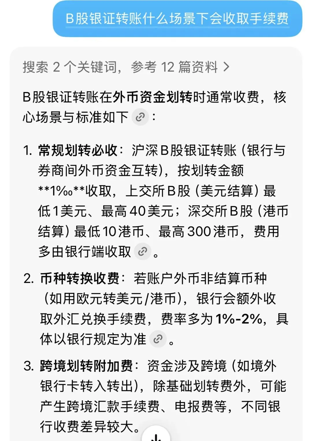 等到下午1点时我试着换汇后用券商APP银证转了一笔账,报错:银行账户已销户(见图六)。😵💫于是赶紧让券商客户经理帮忙查原因,表示要问银行。期间我试了下,A股转账是正常的,怎么就销户了呢?[一团乱麻]火速赶往银行,挂号,排队,柜台工作人员告知要购外币的现钞,不能购外汇(前面的伏笔[笑哭]),于是让柜台帮忙把现汇转成现钞,但是要收取千分之一的费用,办理完成后,担心再出什么幺蛾子,于是在现场银证转了100港元试下水,到账了,Bingo。仔细一看,扣了10元的手续费,这是逆天呀,收10%的费用???问柜台工作人员怎么回事,他们说不是银行收的,问券商那边也说不是他们收的。[摊手]于是自己AI了一把,是银行收的,不过费率是千分之一,有个最低收10港元,最高收300港元的要求(见图七),茅塞顿开了。这么高的费率,早知道不玩B股了,把钱还我[流泪]