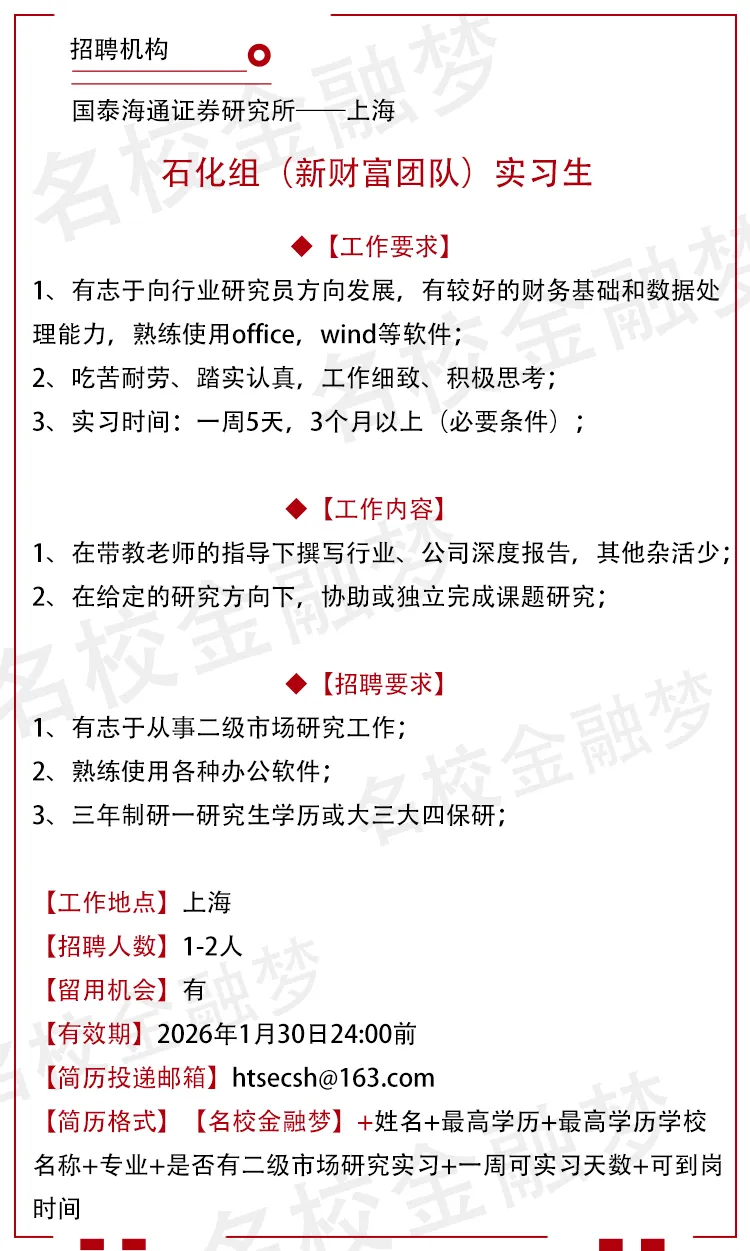 » (01/14)上海今日实习信息|某国企券商研究所、国泰海通证券研究所