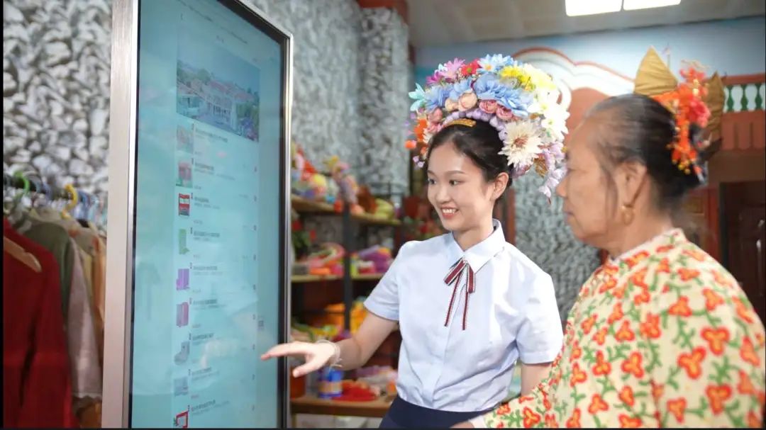 ↑图为泉州农商银行金融助理展示该行在“锦上福农驿站”新布设的电子屏功能。