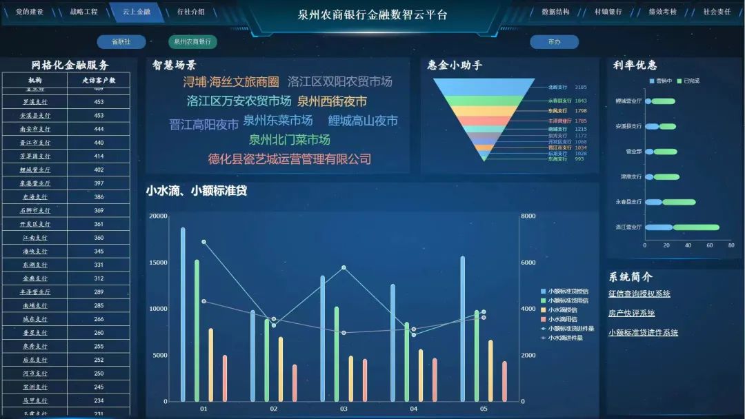 首先,通过金融数智云平台,泉州农商银行串联了福建省农信联社、外部营销系统、线上产品等多个系统,打造整合业务管理报表、融入绩效考核机制、开发网格化服务系统等多项功能,实现数据结构可视化、产品设计标准化、业务营销流程化、数据结构可视化、数仓取数自动化和客户走访常态化。