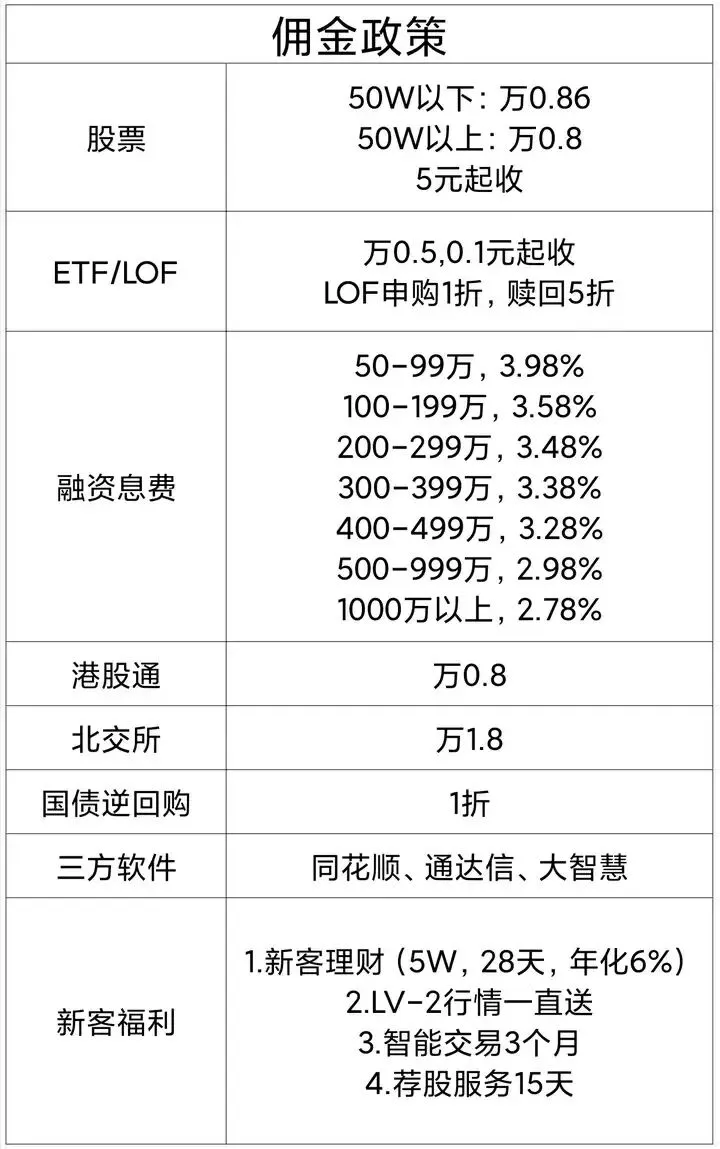 两融开户还是找超大型券商比较靠谱,像银河证券,国泰海通证券,国金证券, 广发证券,开通两融账户之前在网上找到券商服务经理还能调低两融利率,50万的融资利率不高于4%,资金量大话融资利率还能低至2.78%,股票佣金低至万0.85,国债逆回购手续费一折,场内基金和可转债手续费万0.5,比如你买了一万块的股票证券公司仅收取0.85元的手续费,而如果你自己单独开户的话每笔交易至少要收5块钱。