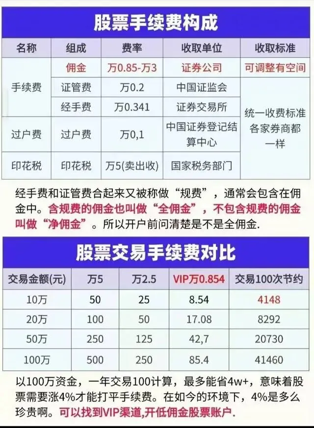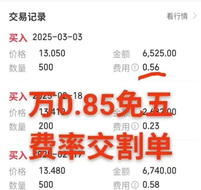 别再给券商打工了!万 0.85 免 5 开户攻略,散户一年能省上千元大家好,今天必须给各位散户兄弟扒一扒股票开户的“坑”,尤其是那些还在同花顺、通达信直接开户的新手和老股民,看完这篇,能帮你每年省下大几千的手续费!先问大家一个扎心的问题:你知道自己的股票交易佣金是多少吗?是不是默认的万2.5?是不是从来没想过,这笔钱日积月累,居然能吃掉你大半的盈利?今天就把手续费的底裤扒干净,再教你怎么开到万0.85免5全佣的账户,真正做到赢在炒股起跑线!一、股票交易手续费,到底被谁赚走了?很多人以为炒股只赚差价,却不知道每笔交易都在“悄悄”花钱!完整的交易费用分三部分,咱们掰开揉碎了说:佣金(券商赚的钱)这是唯一能谈价的部分,也是咱们省钱的核心!这里重点提醒:佣金分净佣和全佣,差一个字,亏大了!全佣 = 净佣 + 规费(规费是万0.541,交给交易所的钱)坑就坑在这!有些渠道吹“万一佣金”,结果是净佣,加上规费实际是万1.541!而咱们要的是全佣,比如万0.85免5全佣,就是实打实的最终费率,没有隐藏费用!过户费(交易所赚的钱)固定万0.1,买卖双向收,这个没得谈,大家都一样。印花税(国家赚的钱)卖出时收千分之0.5,买入不收。这是国家规定,也没得商量。所以,咱们能省的,只有佣金这一项!别小看这点钱,高频交易的散户,一年下来能差出一部手机钱!二、“免5”到底有多香?不懂的人亏惨了!先搞懂两个关键词:万一免5、万0.85免5。老规矩:单笔交易佣金不足5元,按5元收取。这就是“最低5元门槛”。举个最真实的例子,帮你算明白:假设你每次买1万元股票,佣金费率万一。不免5:1万×万1=1元,但因为没到5元,直接扣你5元!免5:直接按1元扣!再看万0.85免5:1万×万0.85=0.85元!比万一免5又省了0.15元!别嫌少!要是你每天交易3笔,一年250个交易日,光这一项就能省:(5-0.85)×3×250=3112.5元!这笔钱,买肉买排骨不香吗?为啥要白白送给券商?三、为啥你开的户,佣金总是万2.5?答案很简单:你走了“默认渠道”!直接在同花顺、通达信、券商APP开户,系统会给你默认的“散户价”——万2.5全佣,甚至更高!券商靠这个赚新手和懒人钱,而那些低佣账户,都是走的券商合作的特殊渠道!这些特殊渠道的账户,都是正规上市券商,部分还是头部券商,资金安全有保障,而且支持同花顺、通达信登录,和你现在用的账户一模一样!更惊喜的是,除了股票佣金万0.85免5,ETF佣金能做到万0.6免5,融资融券利率最低能到3.5%!四、重点来了!万0.85免5账户怎么开?划重点:不要直接在APP开户!不要直接在APP开户!不要直接在APP开户!想要开到万0.85免5的全佣账户,只有一个途径:找靠谱的低佣渠道!首板挖掘这边,已经帮大家整理好了几家上市券商的合作资源,优势直接拉满:✅ 股票佣金:万0.85免5全佣(无隐藏费用,包含规费)✅ ETF佣金:低至万0.6免5✅ 融资融券:利率最低3.5%✅ 平台支持:同花顺、通达信直接登录✅ 安全保障:上市券商,资金受监管,放心靠谱现在开户,不仅能省手续费,还能和千万散户一起交流首板挖掘技巧,炒股赚钱+省钱,双重buff叠满!最后提醒:开户前必看3个避坑点问清楚是全佣还是净佣,别被“万一佣金”忽悠;确认是否真免5,有些渠道会偷偷设置条件;核实券商是否支持同花顺/通达信,避免开户后用不惯。炒股赚钱不容易,能省的钱一分都别放过!与其给券商打工,不如把手续费省下来加仓!有需要万0.85免5开户渠道的朋友,直接私信我!咱们散户团结起来,把手续费砍到最低,一起赚大钱!